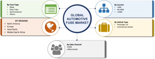 Automotive Fuse Market is segmented By Fuse Type (Blade, Glass Tube, Semiconductor, Others), Current (100a), Vehicle Type (Passenger Car, Commercial Vehicle), Sales Channel (OEM, Aftermarket) and By Region – Global Industry Forecast To 2022.