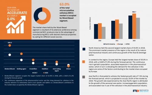 — The global microcrystalline cellulose (MCC) market is forecast to reach USD 1,408.5 Million by 2026, according to a new report by Reports and Data. Microcrystalline cellulose is a product of cellulose depolymerization. It is tasteless and odorless. The market is projected to witness a considerable growth during the forecast period. Its diverse applications primarily support the growth of the market. It is mainly used in the pharmaceutical industry wherein it can be applied as a disintegrating agent and pharmaceutical excipient.
