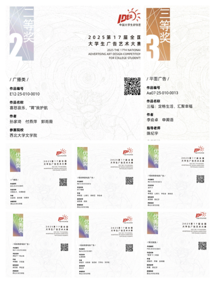 近日,2025年全国大学生广告艺术大赛(以下简称“大广赛”)国赛获奖名单正式公布。作为西北大学“推动计划”A类赛事,大广赛是我国权威认可、影响力广泛的国家级艺术类竞赛。本次赛事中,文学院学子不负众望,斩获全国二等奖1项、三等奖1项、优秀奖6项,总计8项全国级奖项,创历年参赛最佳成绩。此前,在第17届大广赛陕西赛区评选中,我院师生已斩获19项省级奖项,充分展现了文学院在创意人才培养方面的扎实实力。