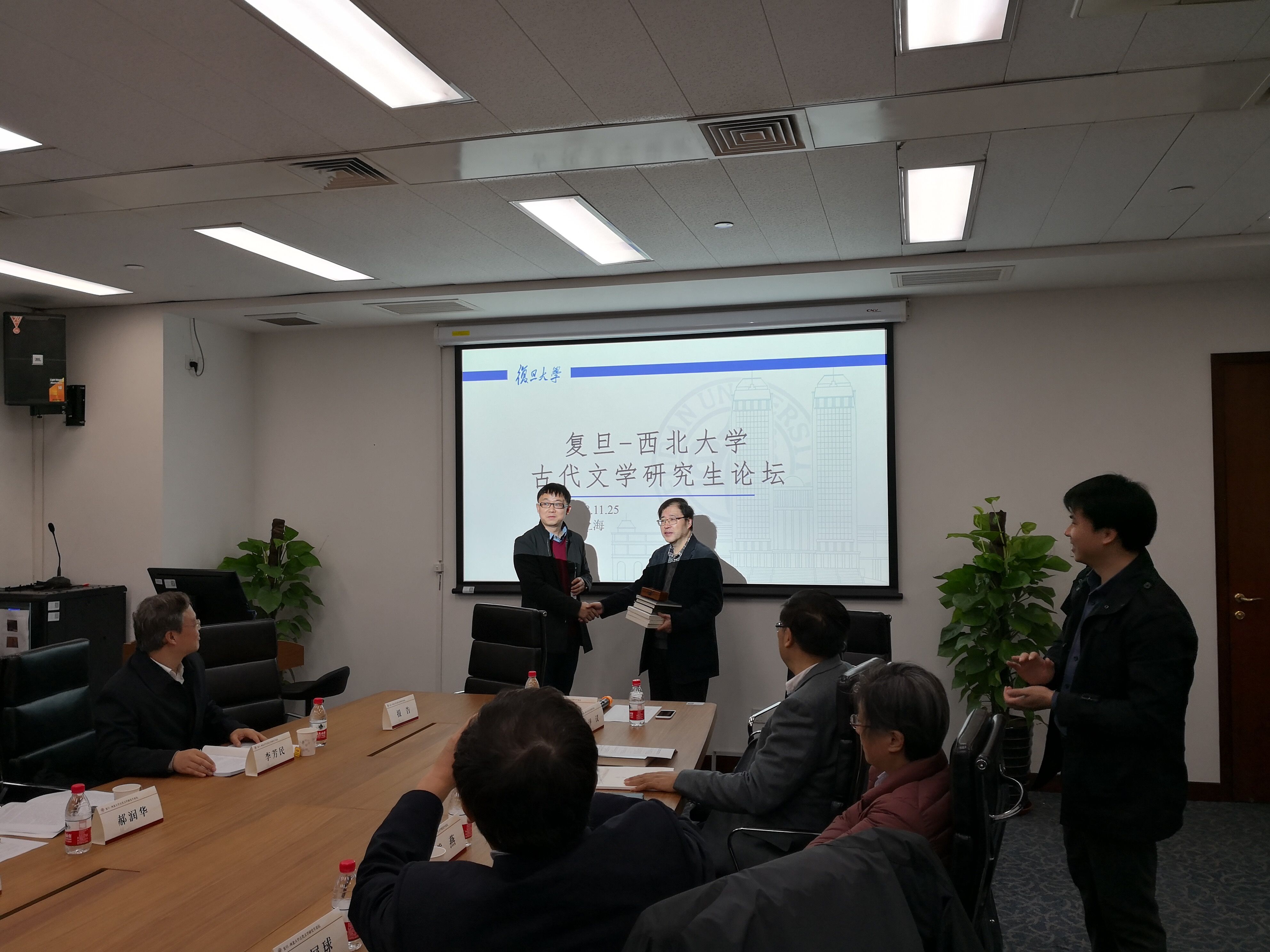 24日,我院师生抵达复旦大学,受到复旦大学中文系古代文学教研室热情诚挚的接待。25日,两校联合举办的“复旦—西北大学”古代文学研究生论坛在复旦大学光华楼西主楼1401会议室举行,两校古代文学师生共同出席参与学术交流。上午9时,召开开幕式,复旦大学中国古代文学研究中心主任陈尚君教授与西北大学文学院李芳民教授分别致开幕式辞。陈尚君教授结合自己多年研究唐代文学的心路历程,对在座的研究生提出期许和激励,指出当前时代研究生面对很多机会,也受到很多挑战,要做有志气的高水平研究。李芳民教授对复旦大学的盛情相邀表示诚挚感谢,并从学术渊源上回溯两校中文学科的历史,历数曾在两校古代文学专业任教的先辈学者的学术情谊。随后,杨遇青教授代表西北大学文学院向复旦大学中文系赠送相关论著和纪念品。