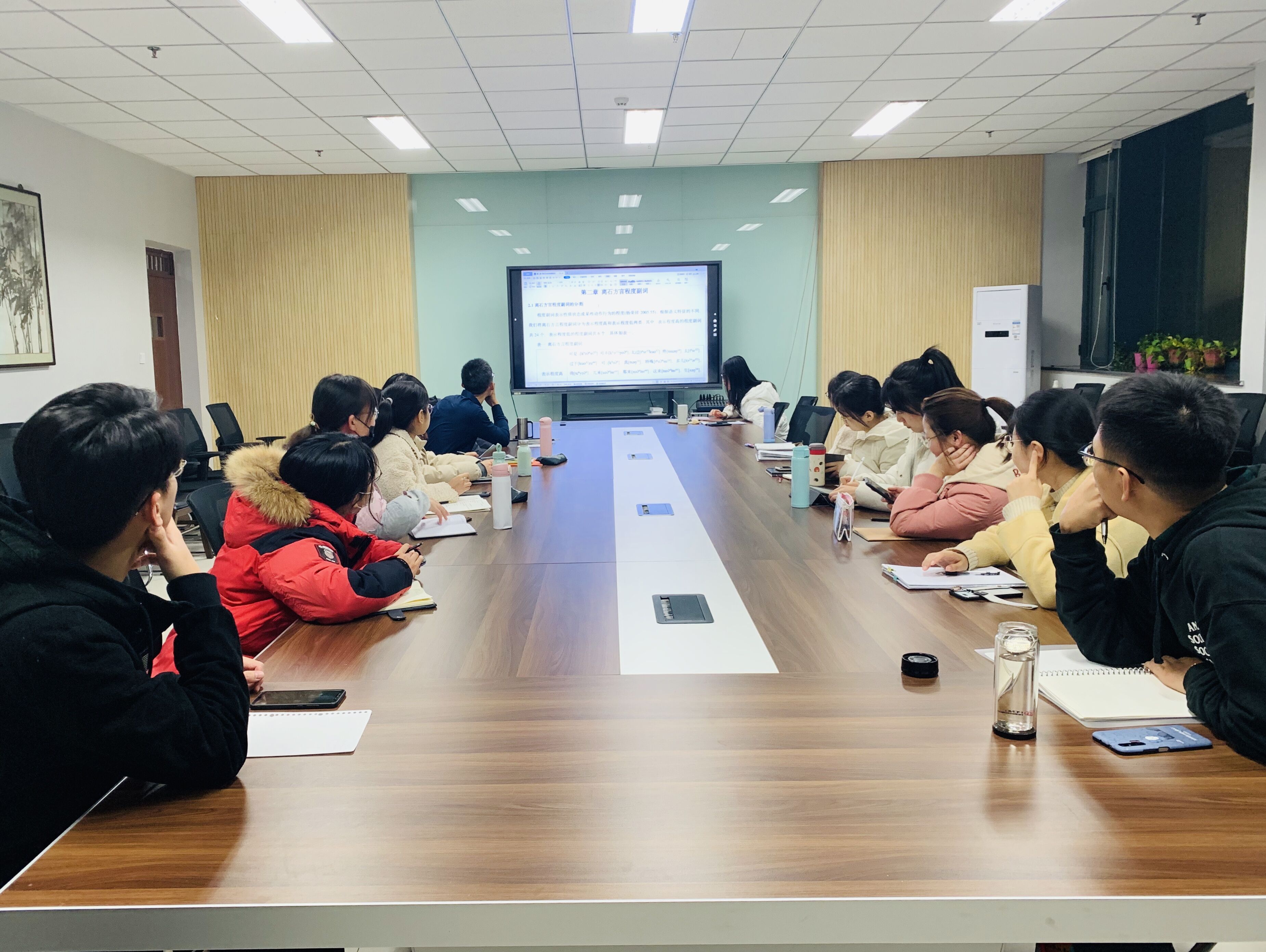 12月14日晚7点,我院第99期语言学读书会在文学院大会议室成功举办。2019级、2020级语言学及应用语言学、文字学专业的同学参加了本次读书会,杨炎华老师到场对同学们的分享讨论进行点评指导。本次读书会主讲人李彦霞作了题为《晋语离石方言程度副词》的报告。