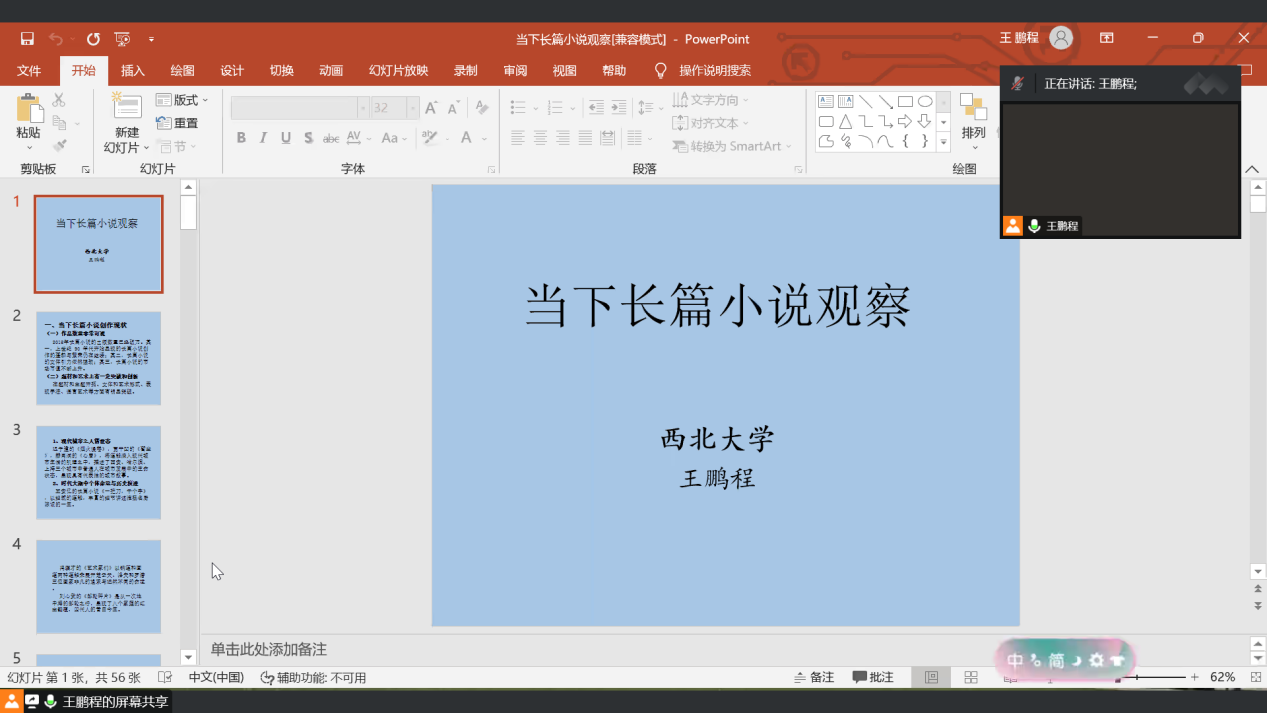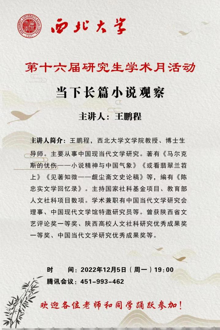 12月5日晚,西北大学“第十六届研究生学术月活动”邀请文学院王鹏程教授为师生作了题为“当下长篇小说观察”的学术讲座。本次讲座以线上会议的形式开展,由姜彩燕教授主持。文学院的部分教师以及本硕博200多名学生参加了本次讲座。