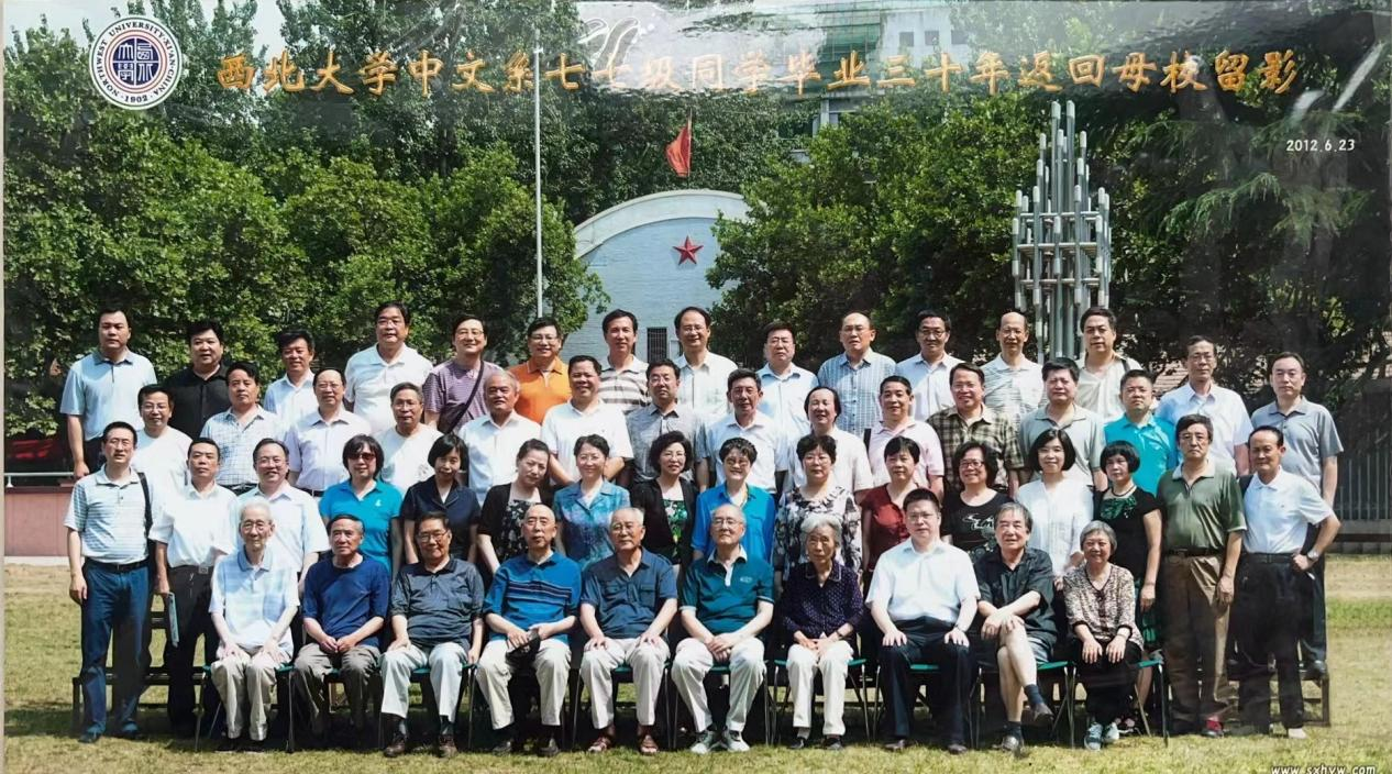 行文至此,本拟收尾打住,但又情不自禁地想起多年前的一件往事。那是2012年6月23日,在我们中文系77级同学毕业30周年返校纪念座谈会上,薛瑞生老师在讲话中叮嘱弟子们“当官的要做清官,治学的要做大学问”之后,即席吟诵《77级同学壬辰端午聚会感赋》五律一首:“一别桥门后,倏而三十春。良辰围几语,佳节对床陈。忍作《骊驹》诵,乐为《鱼丽》吟。白头休叹老,还有后来因。”薛老师在诗中引用多个典故,描述我们毕业后离别与相聚的情境,期待有机会再见面,并一直保留着这次师生团聚的合影照片。令人唏嘘伤痛的是,薛老师已于三年前逝世,期望中后来的师生相聚,我们再也看不到他的音容笑貌了。感怀于老师们的浩浩恩泽,数位先师的西巡离世,李亚军同学在这次返校前夕,写下了古风《毕业四十年怀念逝世恩师六十句》,“痛忆从前事,伤逝泪纷纷。不意长已矣,思之五内焚。”“赋词为尚飨,铭感告微忱!”等诗句,深挚地表达了山高水长有时尽,唯有师恩日月长的弟子情怀。