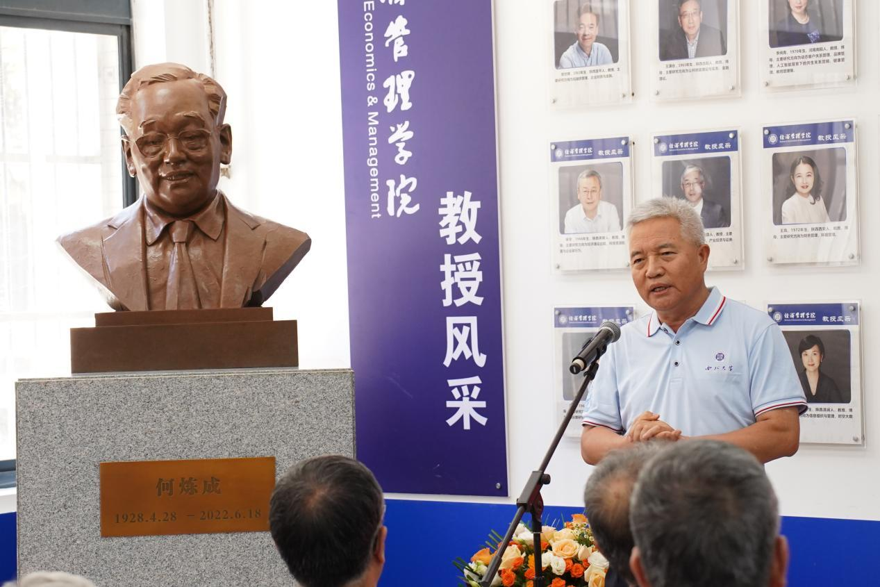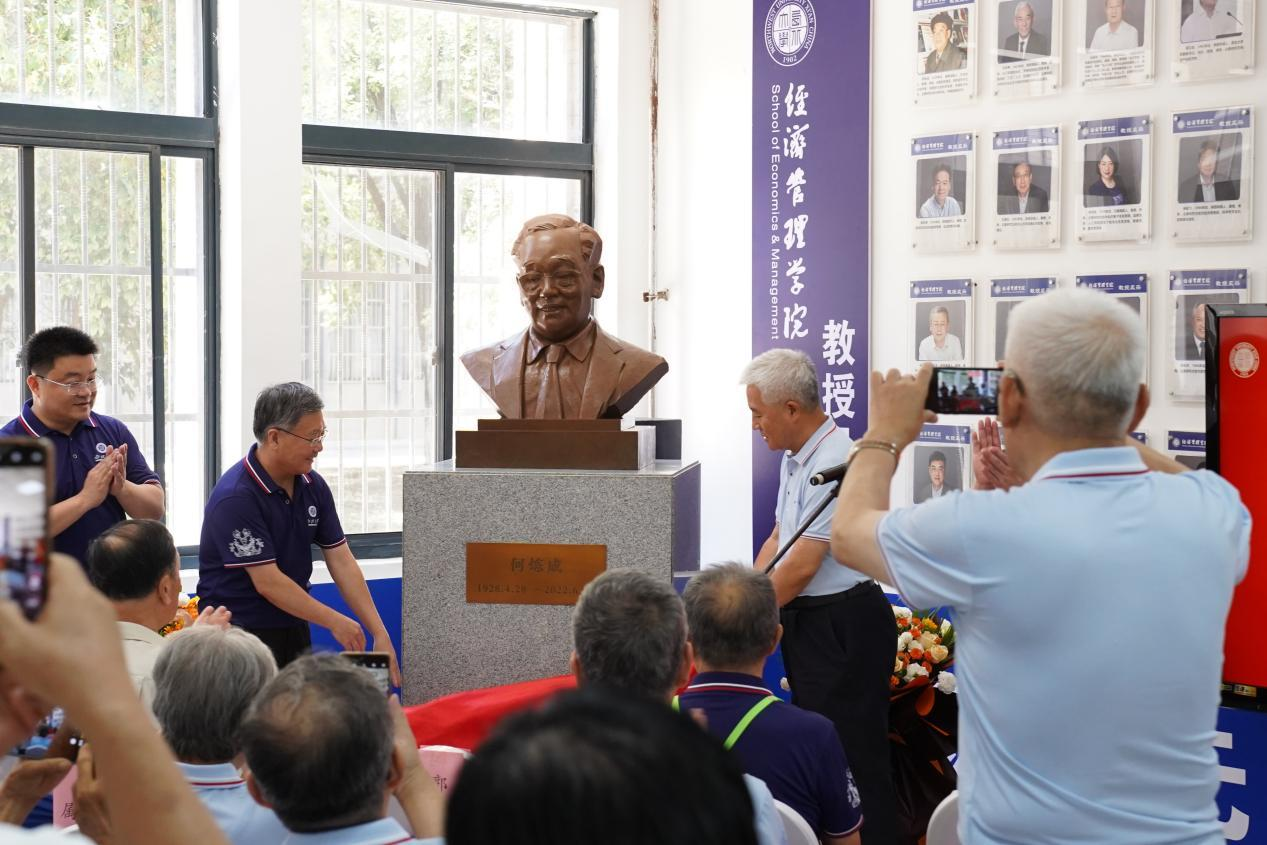 在经济管理学院,举行了由经济系77级校友捐建的何炼成教授塑像揭幕仪式。45年前,是何老师等8位老师创办政治经济学专业,在恢复高考第一年扩大招生时,将这批考生补录进来,把他们带入了经济学的殿堂,并由此发端打造了享誉全国的“经济学家的摇篮”。在2009年出版的《影响新中国经济建设的100位经济学家》一书中,何老师与这级学生中的张维迎、刘世锦、魏杰师生四人联袂入选。毕业四十周年返校之际,经济系77级校友最大的愿望就是为恩师立一尊塑像,致以最崇高的敬意,寄托永久的思念。