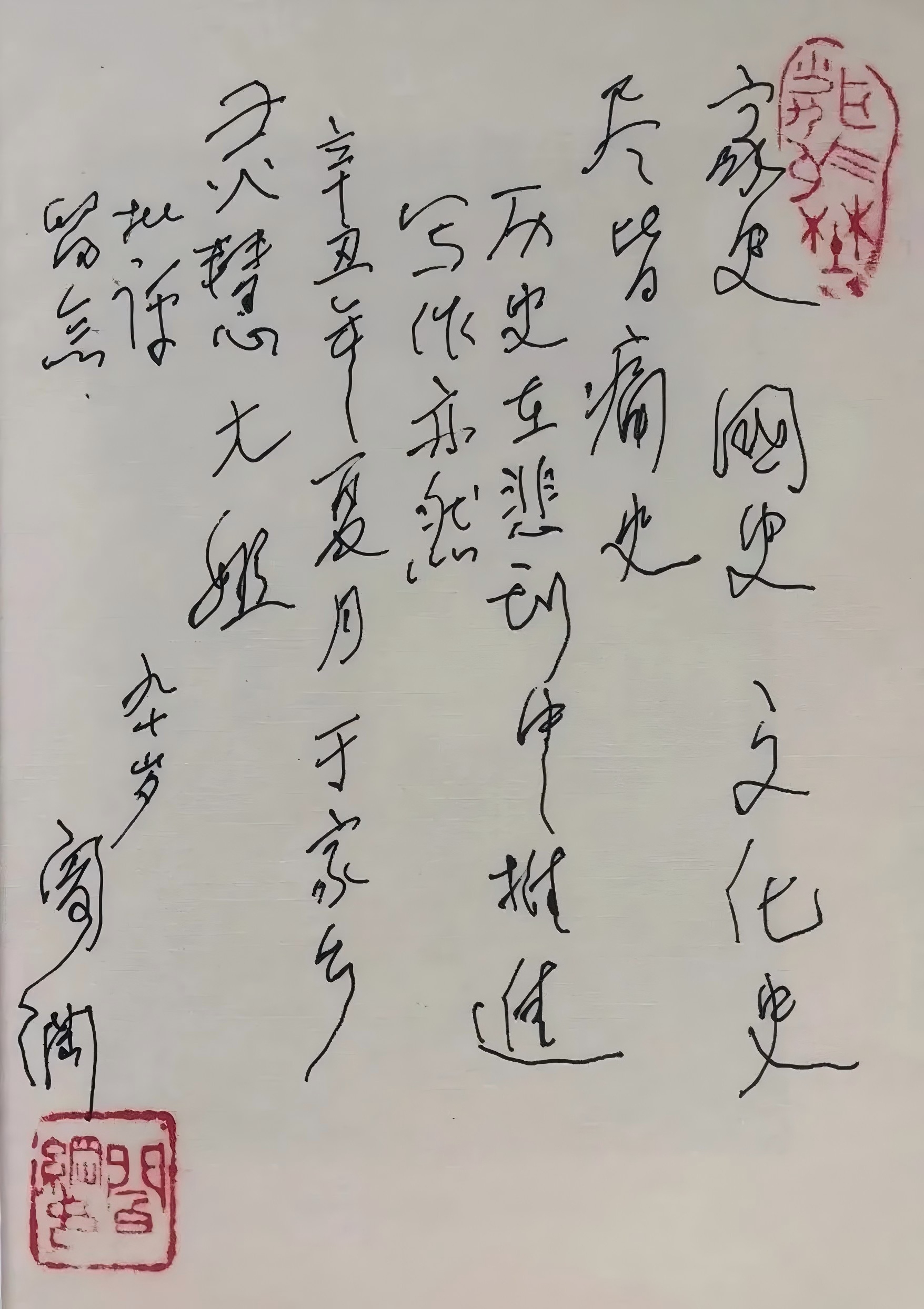 “家史、国史、文化史,尽皆痛史,历史在悲剧中推进,写作亦然。辛丑年夏月于家乡,慧玲大姐批评留念,九十岁阎纲。”