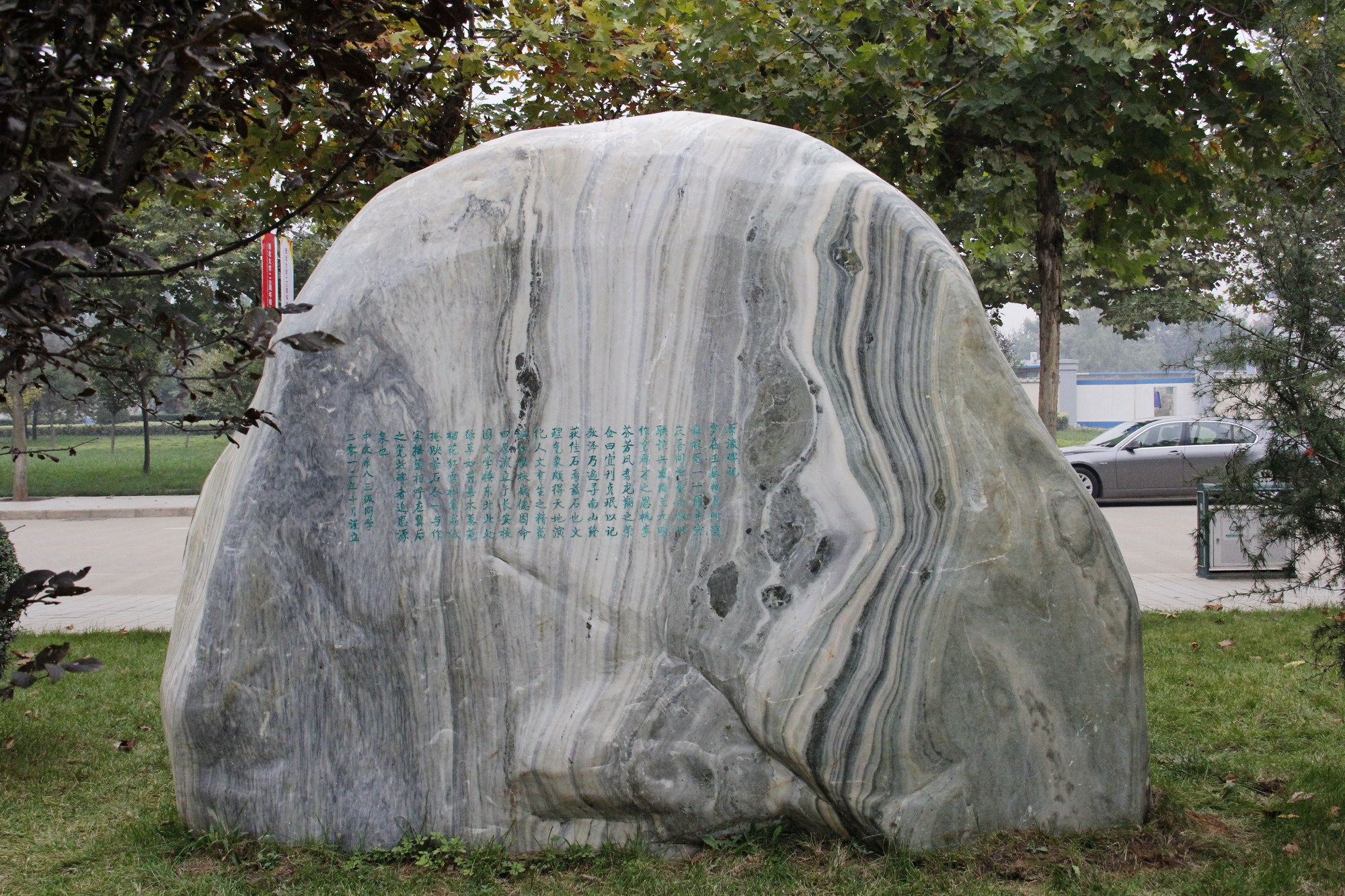 岁在壬辰菊月,时逢母校百一十周年宏庆,吾同学聚会,叙旧联谊,共感滋兰九畹,作育群才之恩;桃李芬芳,凤翥龙翔之荣。佥曰:宜刊贞珉,以记教泽。乃遍寻南山,终获佳石焉。兹石也,文理气象,颇得天地演化、人文育生之精蕴,诚如母校盛德,因命曰“原流”,立于长安校园文学楼东北。此处,绿草如茵,嘉木葱茏,榴花红,雪松翠,高低掩映,景石合一,与作家摇篮相呼应。冀,后之览此碑者,追思源泉也!