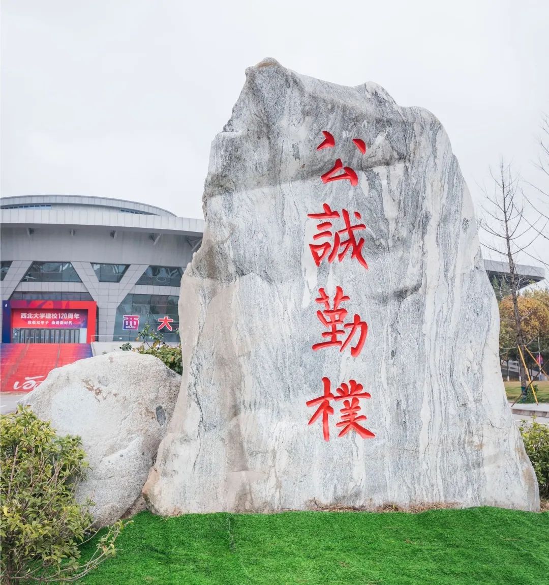 校训石高3.6米,宽1.9米,厚1.1米。正面刻“公诚勤朴”四字,骨力遒劲,结体严紧,笔划之间凝聚着西大精神。校训石树立于长安校区西门,与太白校区西门校训石南北呼应,共同见证百廿西大的峥嵘岁月,砥砺今日西大的莘莘学子。