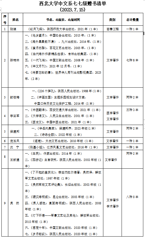 2023年7月15日,文学院举办77、78、79级院友毕业40年纪念活动。期间收到我院1977级院友赠送书籍共85册,1977级院友倪文东赠送书法作品三幅,1977级院友陈学超赠送书法作品一幅,1978级院友捐赠西北大学长安校区东操场十一人制人造草坪足球场地;向学院赠送书籍《转折—1978,我的高考》共80册,1978级院友王晓鹏赠送个人书法作品集共五册。