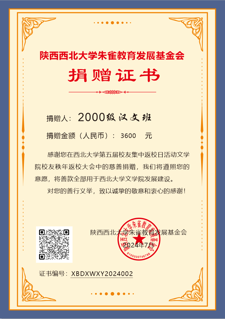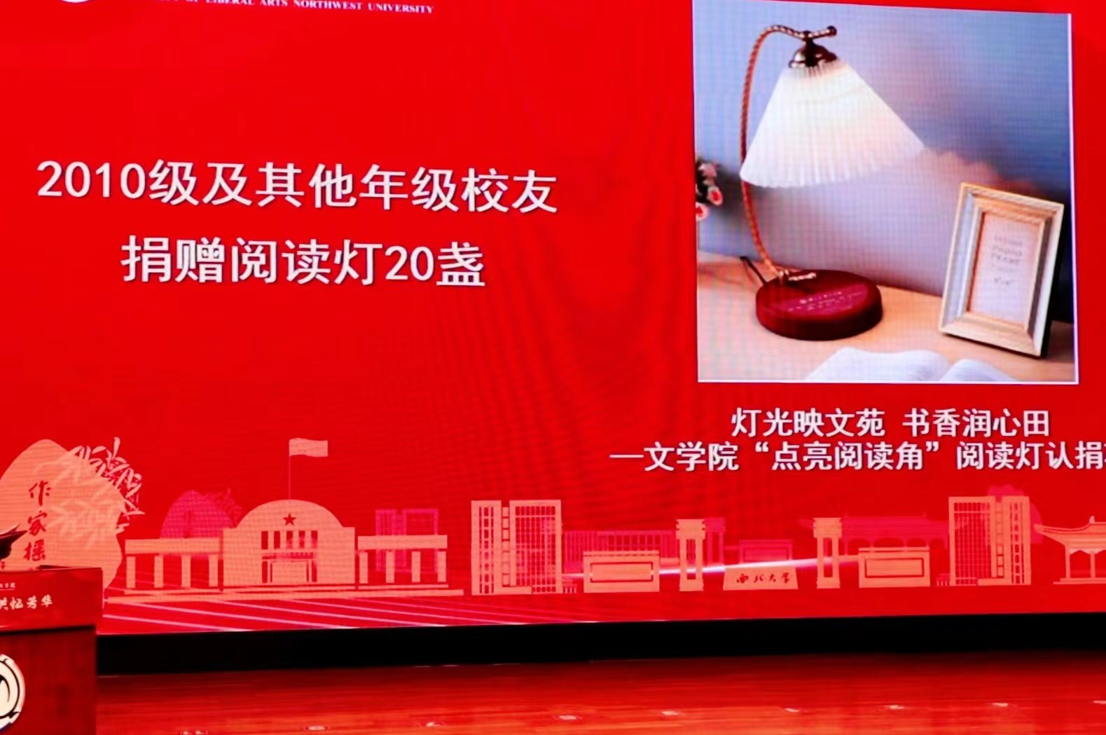 在当天下午举办的纪念大会上举行了返校校友捐赠仪式。其中1980级校友向学院捐赠人民币12万元整,设立“八〇文学奖学基金”,用于奖励在学业、学术研究、文学创作、社会服务等方面表现突出,体现学科综合素质的在校本科生。1980级校友柏一林镌刻印章三枚,赠送学院。1990级校友向学院捐赠人民币2万元整,用于学院发展建设。2000级校友向学院捐赠人民币3600元整,用于学院发展建设,同时向学院赠送金箔装饰画一幅。2010级及其他年级校友积极响应学院“灯光映文苑 书香润心田”---“点亮阅读角”阅读灯认捐项目,认捐阅读灯20盏,将摆放在文学院各阅览区。院长谷鹏飞代表学院接受了捐赠,并为捐赠校友颁发捐赠证书,对慷慨捐赠、襄助学院事业发展的热心校友表示感谢。