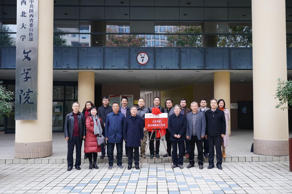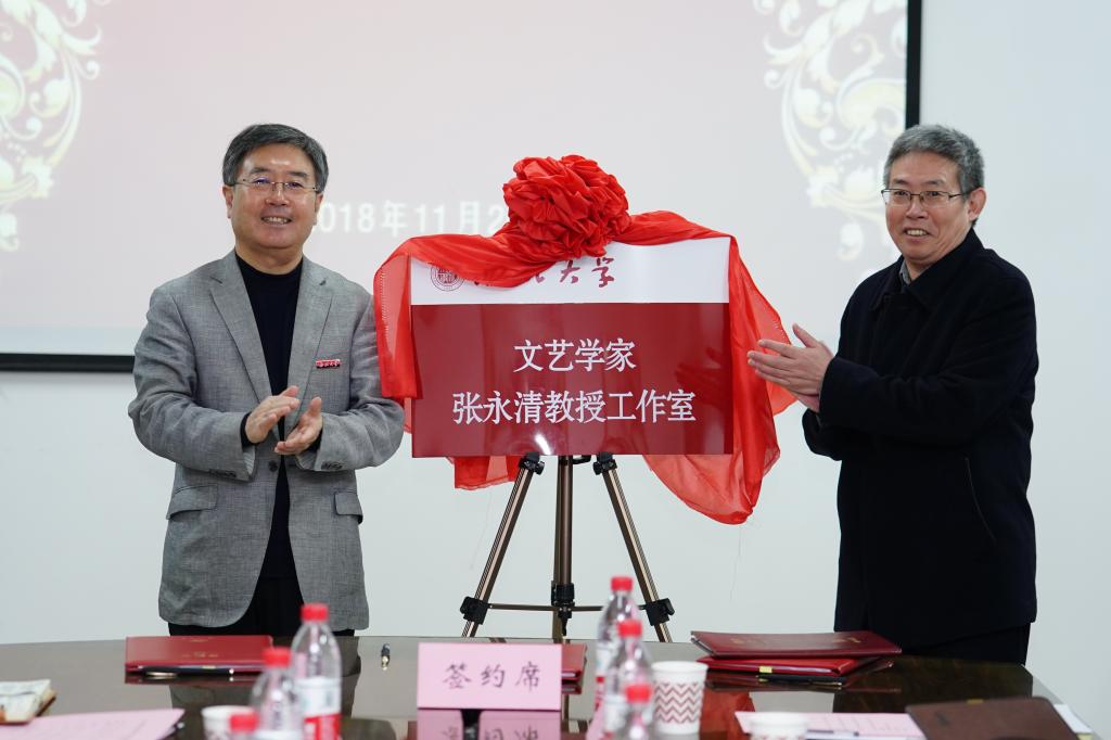 仪式上,高层次人才项目办公室负责人宣读了成立张永清文艺学家工作室的文件。郭立宏、张永清和文学院负责人共同签署合作协议,郭立宏为张永清教授颁发了工作室首席专家聘书,并共同为工作室揭牌。