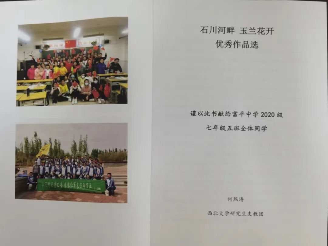 何熙涛还为孩子们制作了一本作文集,取名为《石川河畔 玉兰花开》,作文集中的篇目,有些笔触是稚嫩的,但情感却是真挚的,文字背后藏着许多温暖的故事。当他遇见孩子们,当孩子们认可他,一切都有了坚持的意义。谈及这一年的支教生活,他说有这样一句口号让他印象深刻。“用一年不长的时间,做一件终生难忘的事。”他很庆幸选择了研究生支教团,能让青春增加一抹不一样的色彩。
