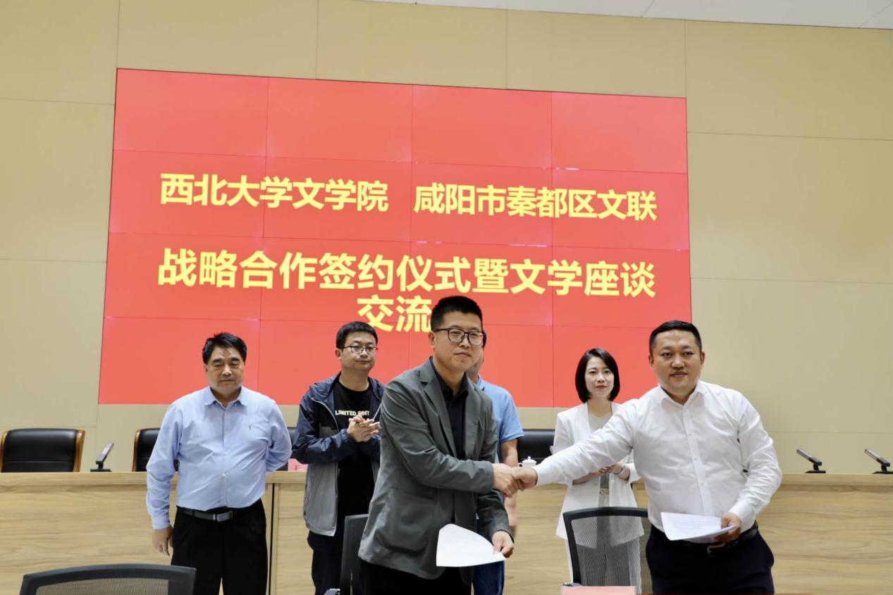 会议宣读了《西北大学文学院 咸阳市秦都区文联战略合作协议》,陈晓辉副院长代表西北大学文学院、米鹏主席代表秦都区文联进行正式签约。安晓东、苏岑、李青部长、王海主席见证签约。