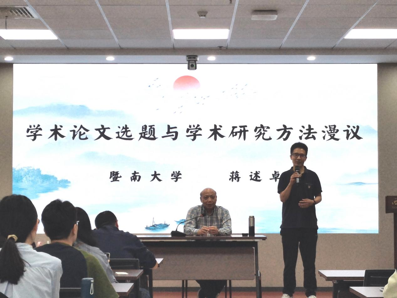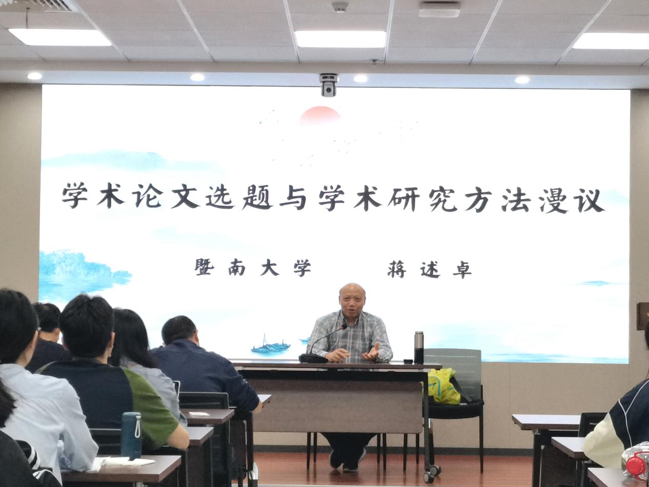 2024年10月21日晚19:30,暨南大学蒋述卓教授在我校长安校区东学楼7层701会议室作了题为《学术论文选题与学术研究方法漫议》的学术讲座。本次讲座由文学院院长谷鹏飞教授主持,我院杨新平、陈海、高翔、何明霞、陈皓钰老师和六十余名博硕士研究生参加。