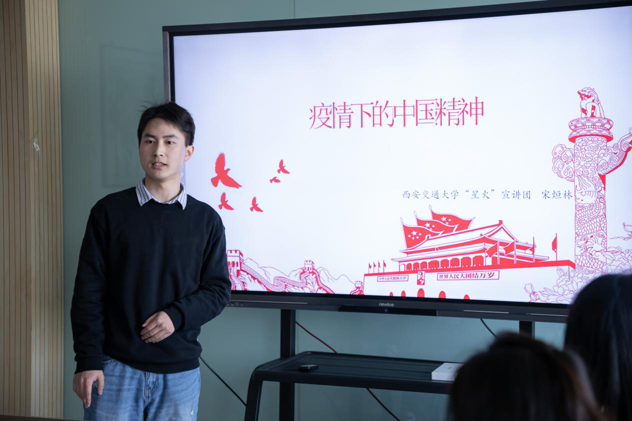 参观后,西安交通大学宗濂书院星火宣讲团李岳明等四位同学在文学院第一会议室为同学们进行了党史宣讲,内容围绕“抗疫精神、结合时事”“西迁精神,特色校史”“五四运动,忆往开来”三个板块展开。同学们结合自身的责任和使命,对抗疫精神、西迁精神及五四精神行交流探讨,表示作为当代青年,一定要继承先辈们留给我们的宝贵精神财富,为祖国建设添砖加瓦,奉献出自己的青春力量。
