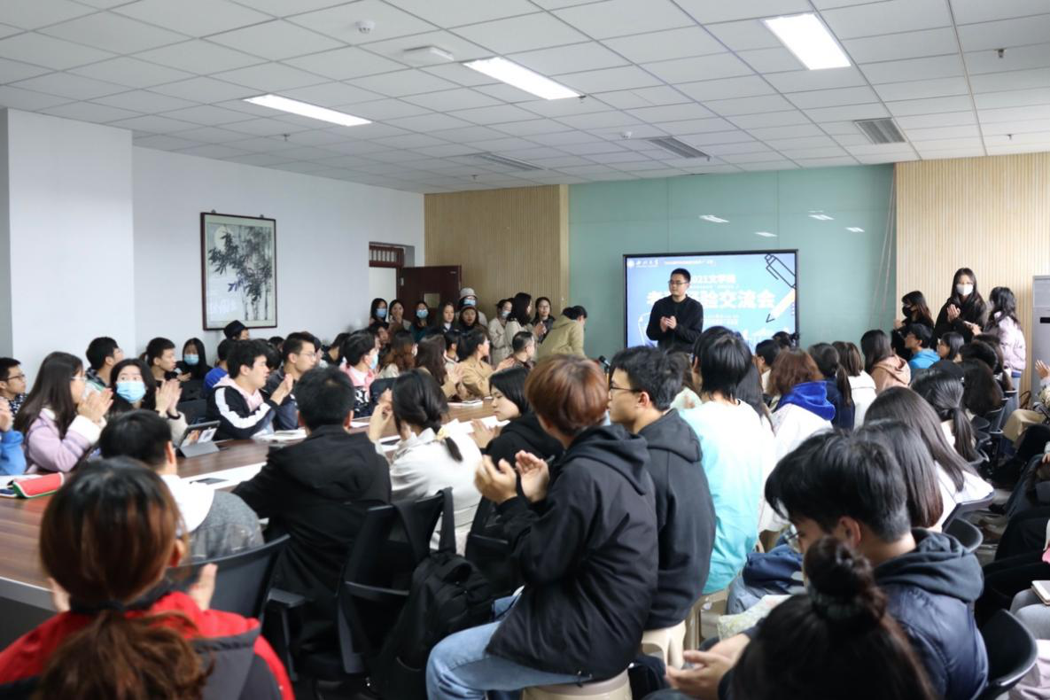 胡双梅同学强调专业复习期间教材细读、整理归纳、真题研究和应用与背诵的重要性,根据本专业情况,结合考试试题制订了由初试到复试的复习计划:初试分为专业一和专业二,重点分享如何记忆文学史以及文学创作,同时介绍了英语和政治的学习方法;复试主要介绍了试题的组成内容,以及如何灵活地运用知识点答题。