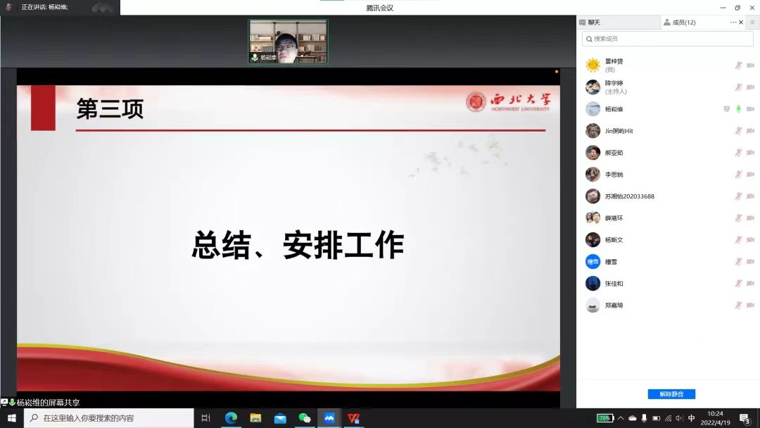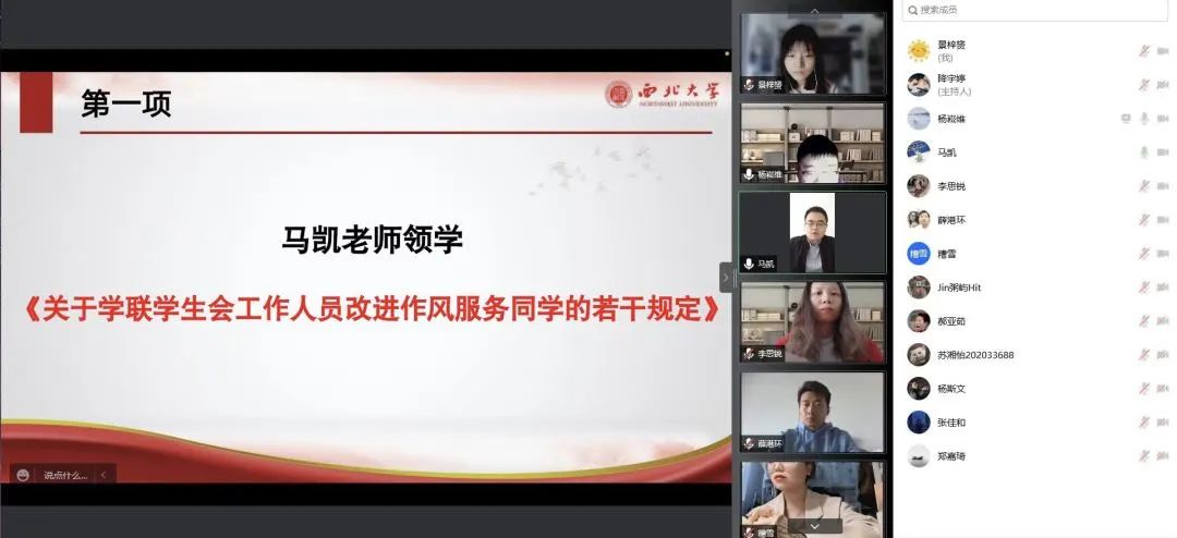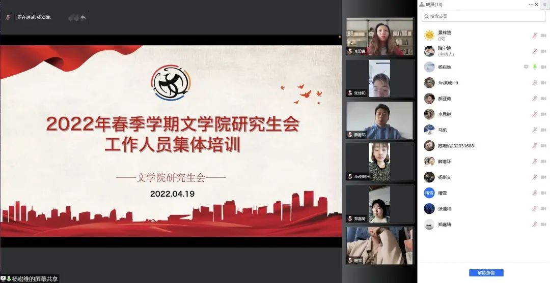 为不断深化研究生会改革工作,提高研究生会工作人员服务意识和工作能力,响应广大青年学子坚定跟党走、奋进新时代的号召,4月19日上午,文学院研究生会组织开展了2022年春季学期工作人员线上培训会,研究生会指导教师马凯及12名工作人员参加了培训,执行主席杨崧维主持会议。