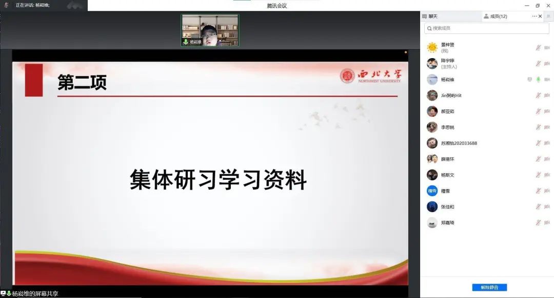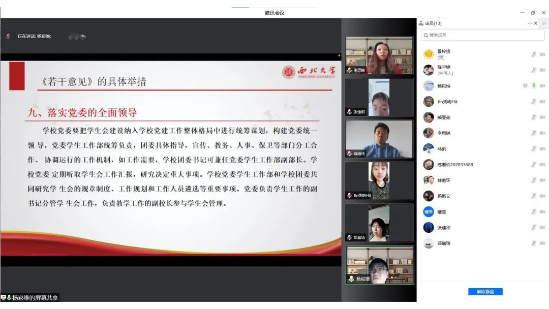 随后,执行主席杨崧维带领大家集体研学了陕西省学联学生会组织工作人员集体培训会的内容,主要分为三部分:第一部分主要从历史文件角度梳理学生会发展历程,强调要在回顾历史沿革的基础上发挥传承创新精神;第二部分从新时代新要求入手,分析系列改革文件要求,阐明当代学生会组织建设在政治性、先进性和群众性三方面的基本任务;第三部分讲解了深化高校学生会组织改革的主要目标和具体措施。