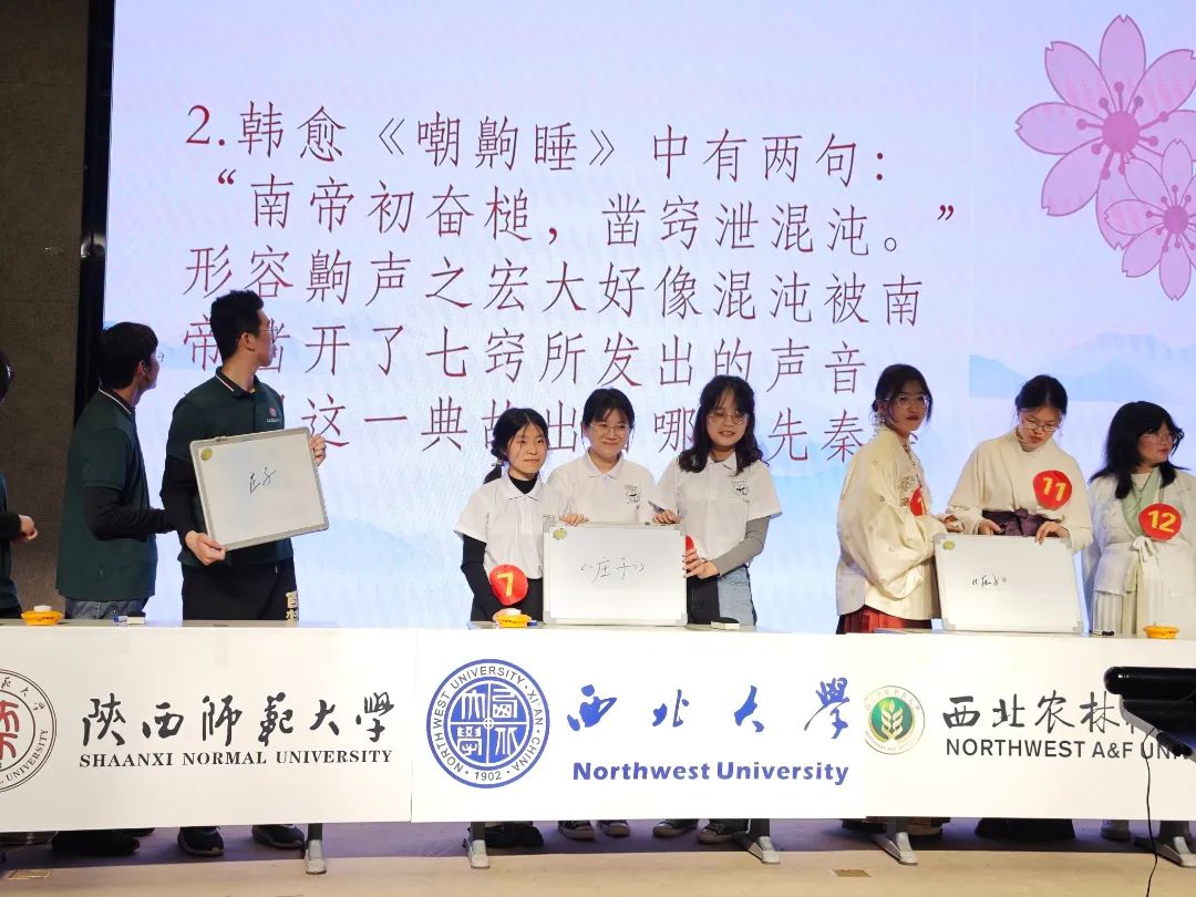 赛前准备阶段,我院统筹谋划、精心组织,经过笔试、现场竞技等环节,我院陈冉、金泽萱、刘若雨田3位同学凭借丰富的诗词储备和灵活的应变能力脱颖而出,代表西北大学参加比赛。
