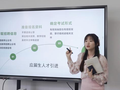 王煜琨同学应聘的岗位是江苏省无锡市的教师编制,她参加了多场江浙教师编人才引进招聘会,她提醒同学们要提前了解所报地区的人才引进流程,细致地阅读相关文件。王煜琨学姐为大家详细讲解了江浙教师编制的招聘流程以及注意事项,从着装、备考、临场发挥等角度给了大家一些实用性建议。