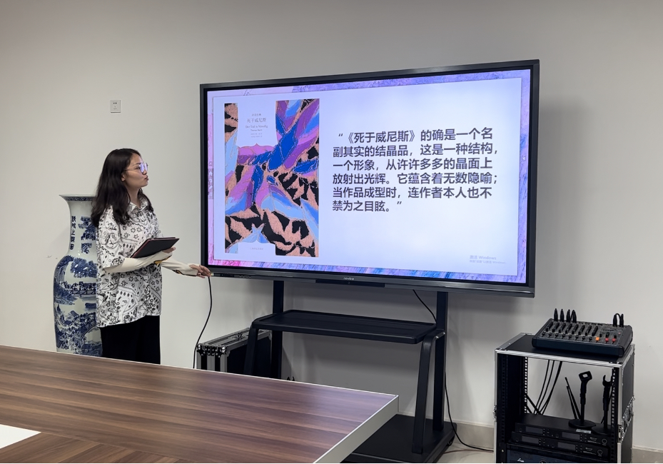刘财英同学分享的书籍是托马斯·曼的《死于威尼斯》。作者于1929年获得诺贝尔文学奖。本书是一个名副其实的结晶品,是一种结构,一个形象,从许许多多的晶面上放射出光辉。