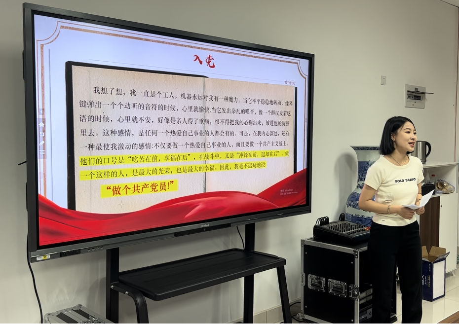 杨军岩同学分享的书目是吴运铎先生的《把一切献给党》,她带领大家一同走进被称为“中国的保尔·柯察金”的吴运铎真实而忠诚的一生。在杨军岩的讲述中,大家了解到吴运铎最初的梦想是成为管机器的工人,在抗日战争爆发后,他毅然加入新四军,从此开始与枪炮制造紧密相连的一生。除了使他着魔的机器,他内心深处还有一份最激动的感情:做一个共产主义战士。因此他毫不犹豫地加入了共产党。在没有材料、没有固定场地等诸多困难的压力下,吴振铎迎难而上,从无到有,制造出榴弹炮、平射炮等武器。在此过程中,他三次负伤,历经20余次手术,身上有几十处弹片没有取出。即便如此,吴运铎依旧说:“把我们的一切,都交给祖国、交给人民、交给党吧!做一个无限忠诚的战士,永远前进!”在分享中,杨军岩同学多次深情地诵读文中吴云铎的内心独白,展现出一个中国共产党员对党最为热烈而深沉的爱。最后,她号召同学们将自己的力量贡献给中国伟大腾飞的梦想,永远保持着对党的忠诚与热爱。