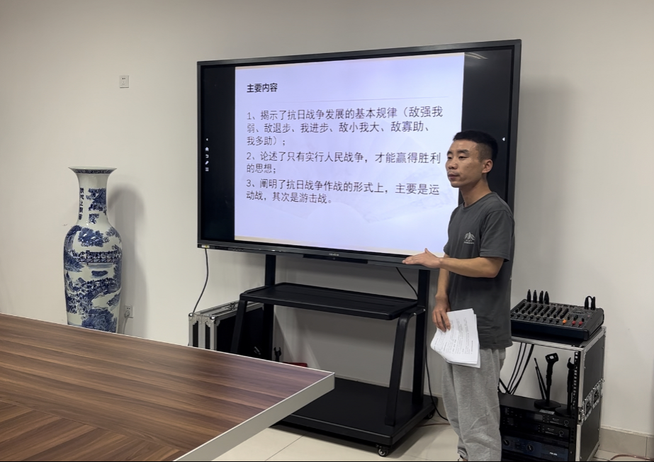 刘志晨带领大家一同梳理了书中内容,指出本书揭示了抗日战争发展的基本规律:敌强我弱、敌退步、我进步、敌小我大、敌寡助、我多助,论述了只有实行人民战争,才能赢得胜利的思想,阐明了抗日战争作战的形式主要是运动战,其次是游击战。书中,毛泽东同志精当地运用了“犬牙交错”这一成语,使人们明白了“长期而又广大的抗日战争,是军事、政治、经济、文化各方面‘犬牙交错’的战争”。而这场战斗,兵民是胜利之本。《论持久战》不仅在国内成为指导抗日战争的科学的军事理论,而且在世界军事学术史上也有极高的学术价值。最后,刘志晨从书本回归学习与生活,结合实际与大家分享了自己的读书感悟,认为人生也是一场不折不扣的持久战,希望同学们遇到困难时能够客观分析形势,利用有利因素,扭转不利因素,从容面对困境。