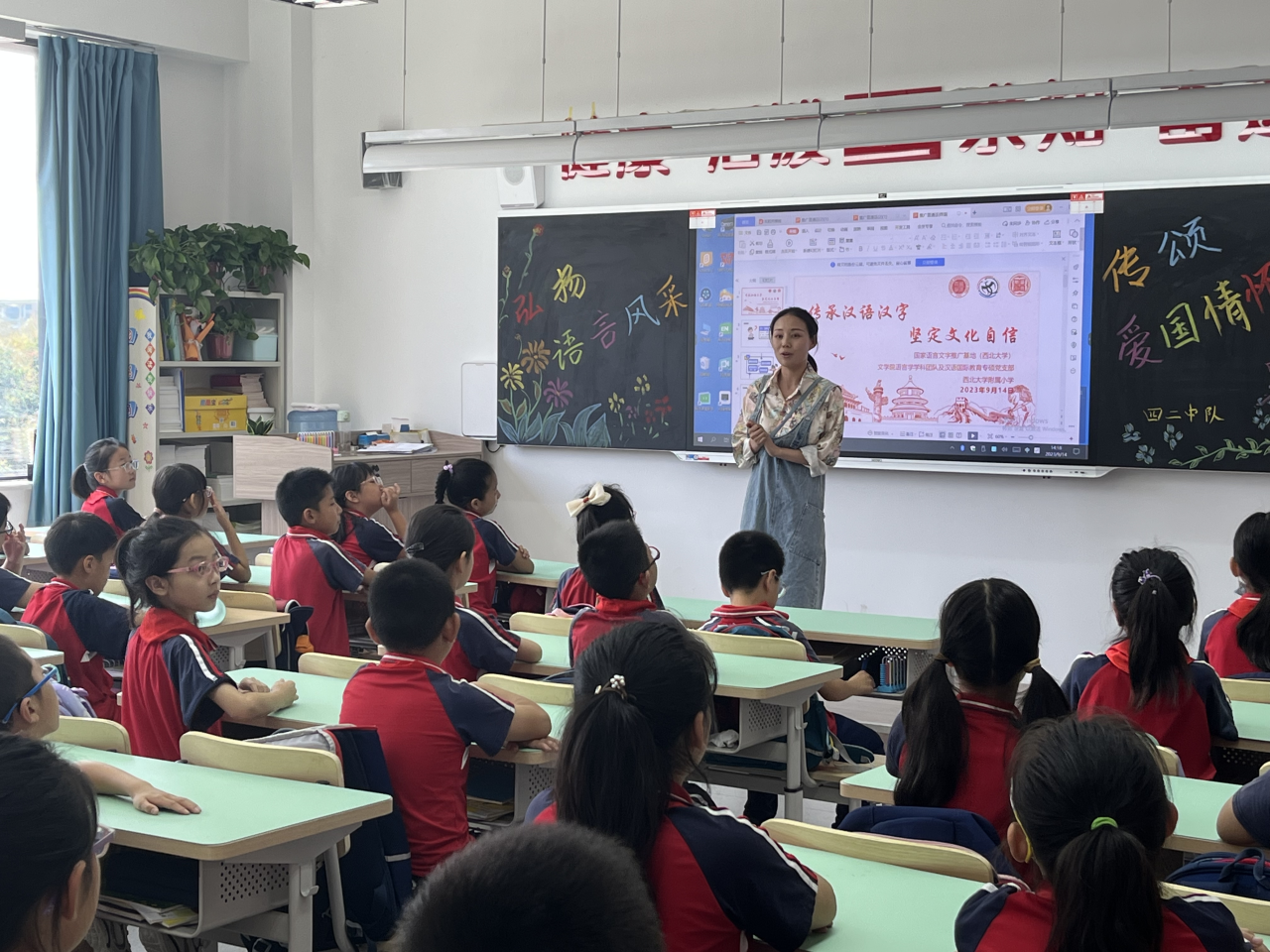 习近平总书记在党的二十大报告中强调,“加大国家通用语言文字推广力度”,为深入学习贯彻党的二十大精神,推动全面学习习近平新时代中国特色社会主义思想,贯彻落实全国语言文字会议精神,加大国家通用语言文字推广力度,2023年9月14日,国家语言文字推广基地(西北大学)、语言学学科团队党支部、汉语国际教育专硕党支部联合西北大学附属小学,于第26届全国推广普通话宣传周开展主题为“传承汉语汉字,坚定文化自信”推普活动。