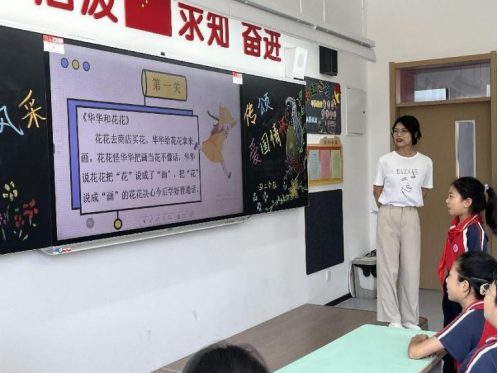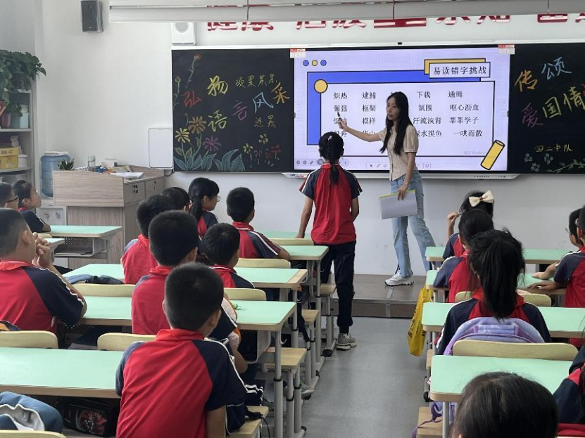 在简单问答过后,进入速读绕口令活动,党员同志在黑板上出示三段不同的绕口令鼓励同学们挑战,在前几位同学挑战失败后,一位同学口齿清晰一字不差地完成了三首绕口令的挑战,引起大家的热烈掌声。在党员同志和小朋友的不断互动中,锻炼了小朋友们的语言能力和快速反应能力,在不断相互学习中激发说普通话的兴趣,让党员同志们在和小学生的相处中亲身体会到了传播中华文化的使命和责任。