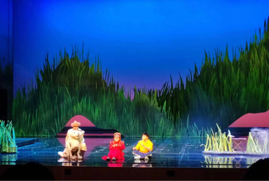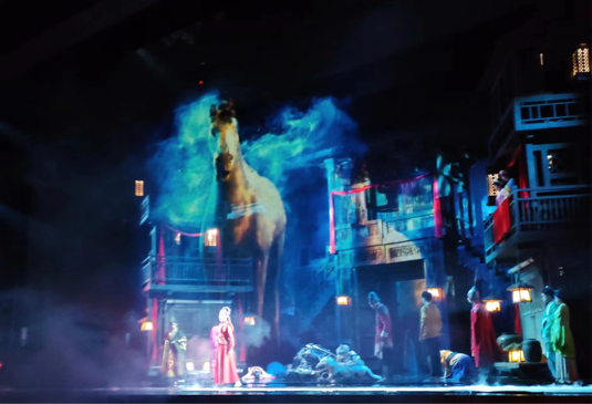 此外,《丝路之声》中的舞台技术的运用也很值得分析,如舞台机关的设置与投影的配合运用。“素素飞刀”的情节中,就运用了人为操作的舞台机关来实现江湖技艺,剧中的马、骆驼、狼、鸡鸭等动物均采用了机械道具,关节可活动,舞台效果栩栩如生。此外,在沙漠、血汗、星辰等意象的表现和抒情的歌曲中,舞台靠前的半透明幕布与投影的配合完成了非常诗意浪漫的造景。在视觉上让人大饱眼福。