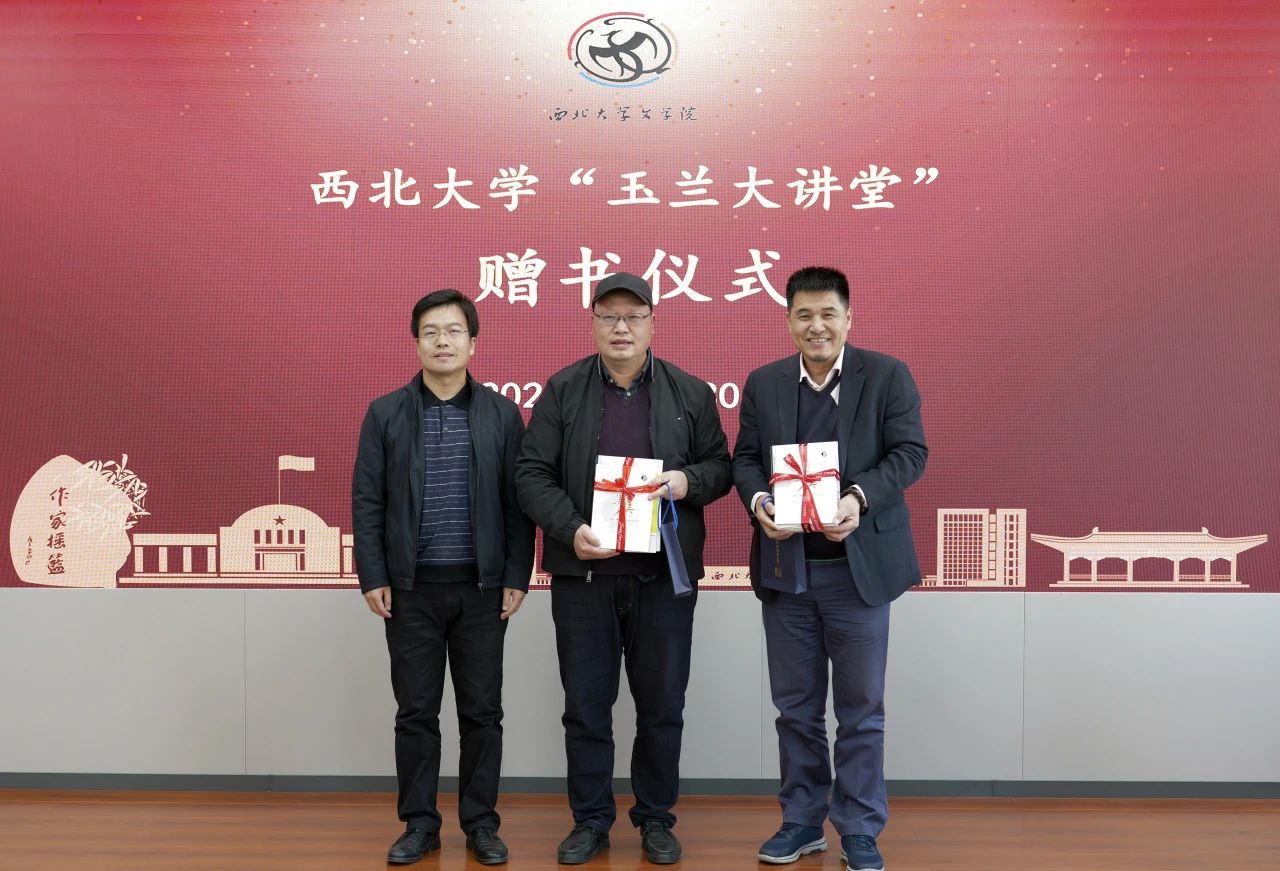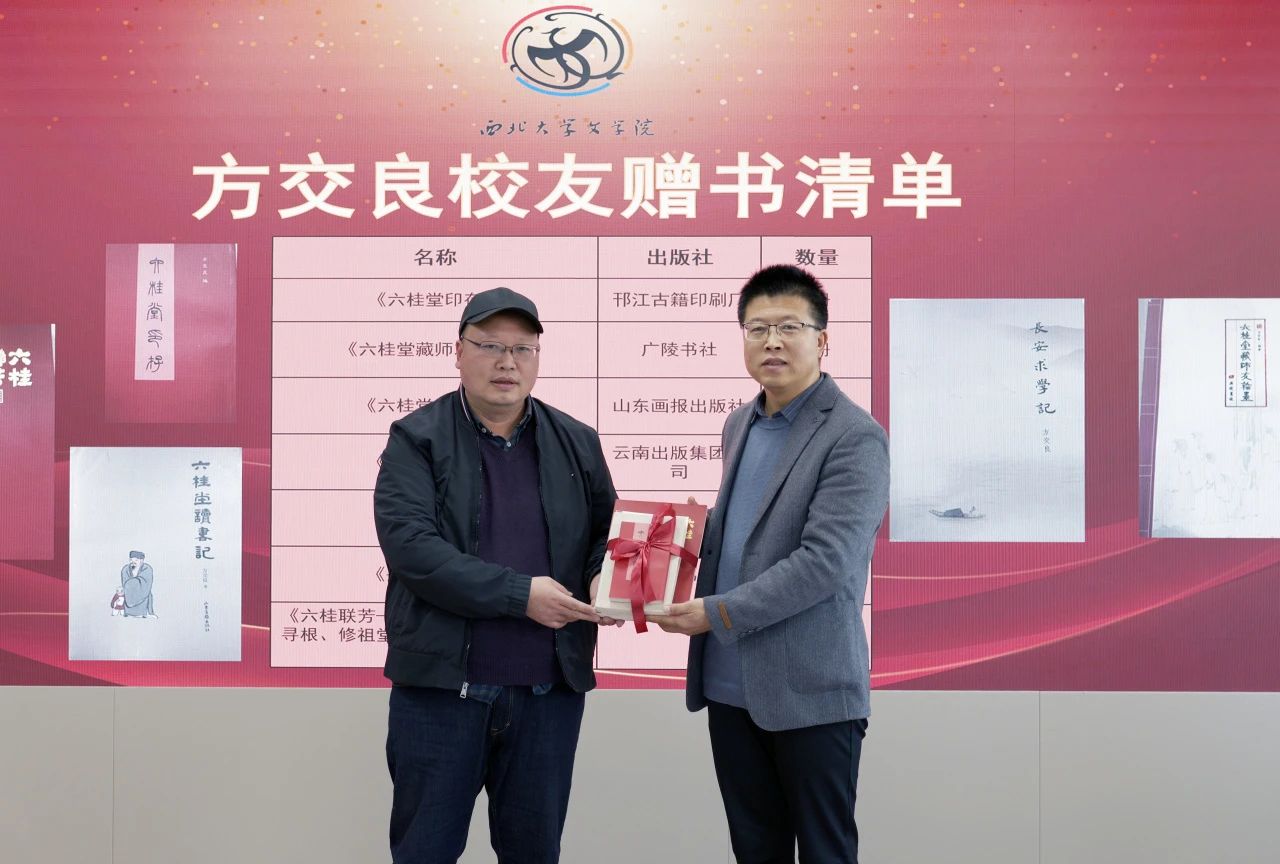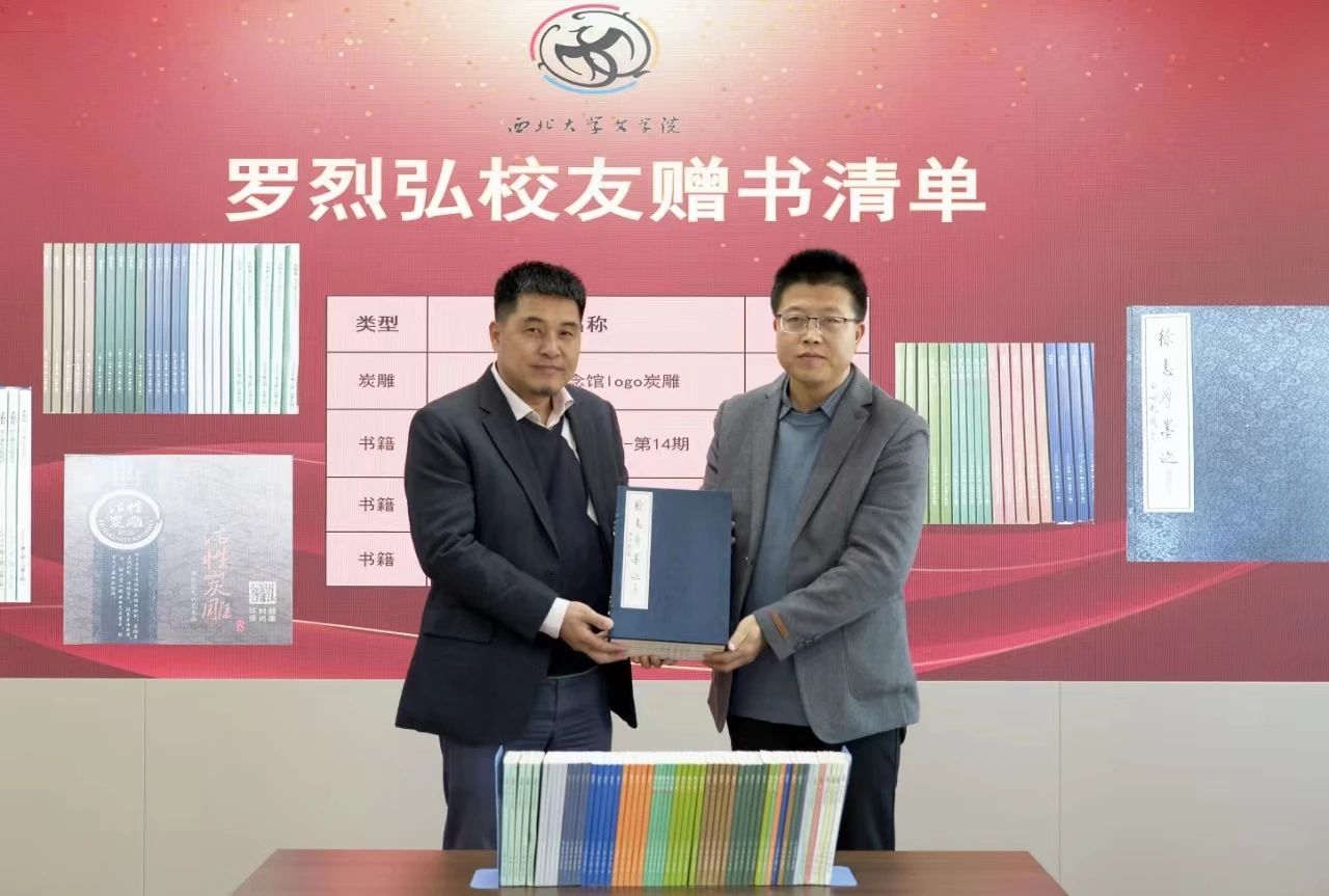 讲座前,先进行了赠书仪式。罗烈弘向学院赠送由其编著的《徐志摩墨迹增补本》、徐志摩纪念馆logo炭雕、馆刊《太阳花》等书籍和纪念品;方交良向学院赠送其著作《长安求学记》《泱泱中文系》等书籍。陈晓辉代表学院向校友回赠收藏证书,陈柯为两位校友回赠了我院教师主编的新书《西北联大文学作品选》以及我院“黑美人”艺术节、“抒雁杯”青春诗会作品集。