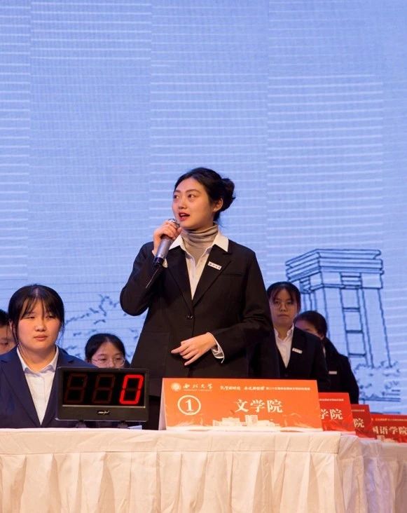 盼望着、盼望着,决赛的日子定了,过去两个月遥遥无期的备赛与等待终于落地。最后的一周,教室里的灯总是亮到很晚。在这里,我们是相互勉励的同辈、是并肩作战的队友。当代表文学院坐在台上,面对台下的观众,入场时我因回忆不畅而产生的焦躁渐渐平息,眼前闪过两个月以来的一幕幕——得知我们进入决赛后,老师与学姐们为我们欢呼庆贺;背书感到枯燥乏味时,学姐帮我们调整情绪;每隔几天的小考核是紧张又兴奋的时刻,迫不及待想看自己有没有进步……背书的苦一起吃,煎熬的关一起过,成功的甜一起尝——与我并肩作战的人就在身边,我们是彼此定心丸,还有什么可担心的呢?于是答案脱口而出,应对自如。一轮轮过关斩将,大家渐渐能享受比赛的乐趣,也为其他队伍的精彩表现喝彩。我们自信从容,赛出了文学院的风度。美中不足的是有几道题我们的答案与标准答案十分接近但仍有差距,因此失分扣分,对比其他组的精彩表现,还有所欠缺,希望学弟学妹们能吸取我们的经验和教训,在明年的比赛中更上一层楼!