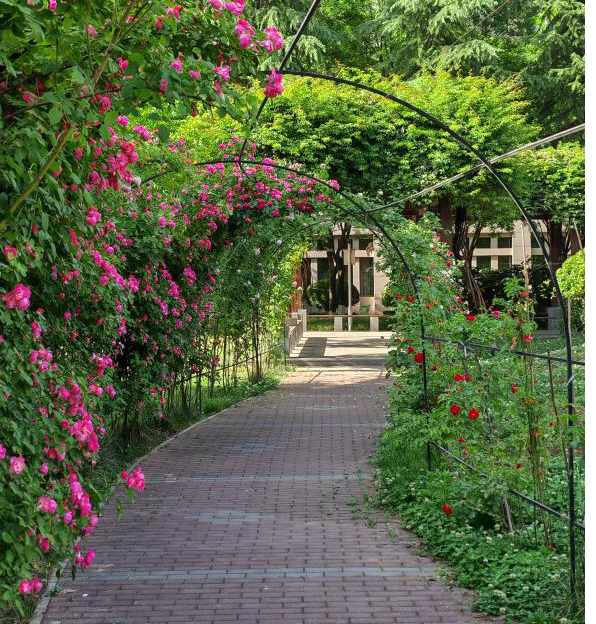 在火辣的太阳下结束一天的课程,疲惫又倦怠,走到丁香园误入莫奈花园,夏阳泼洒金箔,蔷薇在风中仰起脸,香甜漫出枝蔓,簇成紫红云朵,微风习习,疲倦一扫而空,我在这里邂逅生命的诗意。