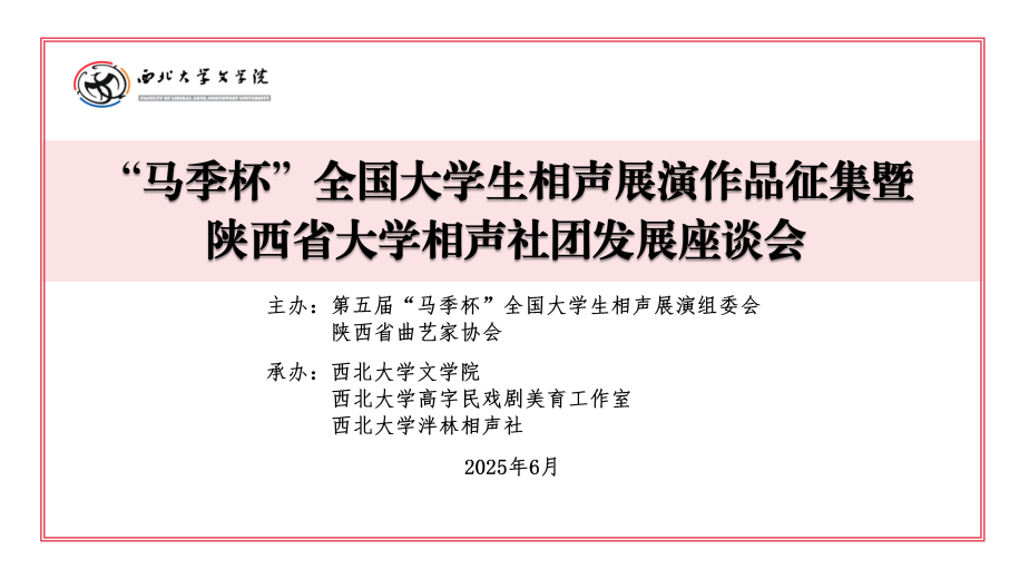 6月5日下午,“马季杯”全国大学生相声展演作品征集暨陕西省大学相声社团发展座谈会在西北大学长安校区文学院第二会议室隆重举行。本次会议由第五届“马季杯”全国大学生相声展演组委会、陕西省曲艺家协会联合主办,西北大学文学院、西北大学高字民戏剧美育工作室、西北大学泮林相声社共同承办,旨在以作品征集为契机,深化高校曲艺社团交流,推动高校艺术美育建设与优秀传统文化的创造性转化、创新性发展。