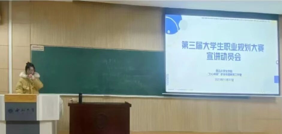 动员会上,“文心林薮”职业生涯教育工作室学生团队成员王湘解读了《西北大学关于举办第三届大学生职业规划大赛的通知》,系统讲解了大赛的核心框架,涵盖赛事背景、举办目的、核心意义、时间节点安排及整体赛事内容,为同学们构建了对赛事的全面认知。在此基础上,重点解读了大赛报名的完整流程,明确各阶段的任务节点与衔接要求;清晰介绍了赛道设置的逻辑与各赛道的侧重方向,详细阐释了评审标准的核心维度与评分细则,为参赛准备提供明确指引,助力同学们精准匹配自身优势。同时针对生涯发展报告的撰写逻辑,内容架构等实操性问题,给出了具体的建议。