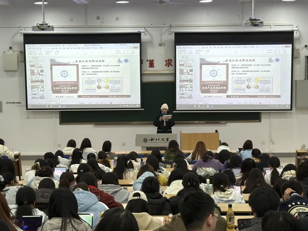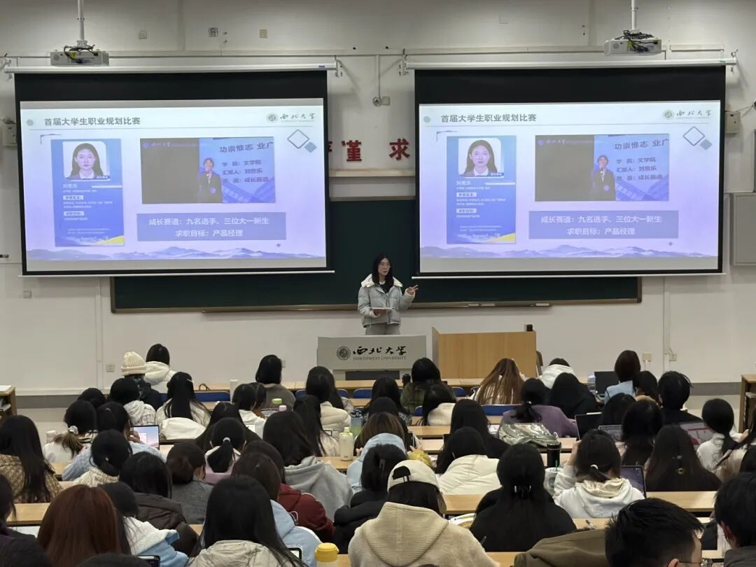 西北大学第二届大学生职业规划大赛成长赛道校级优秀奖获得者樊睿思分享了她从“模糊憧憬”到“精准聚焦”的参赛心路转变。参赛初期,她的职业目标停留在文化传播相关领域的宽泛认知,随后在老师和专家指导下,通过行业调研、自我特质分析,逐步将目标细化为“文博机构文创产品策划运营师”,既贴合汉语言文学专业的文字表达、文化解读优势,又契合当下非遗传承与乡村文旅融合的社会需求,让职业目标有了清晰的定位与现实支撑。