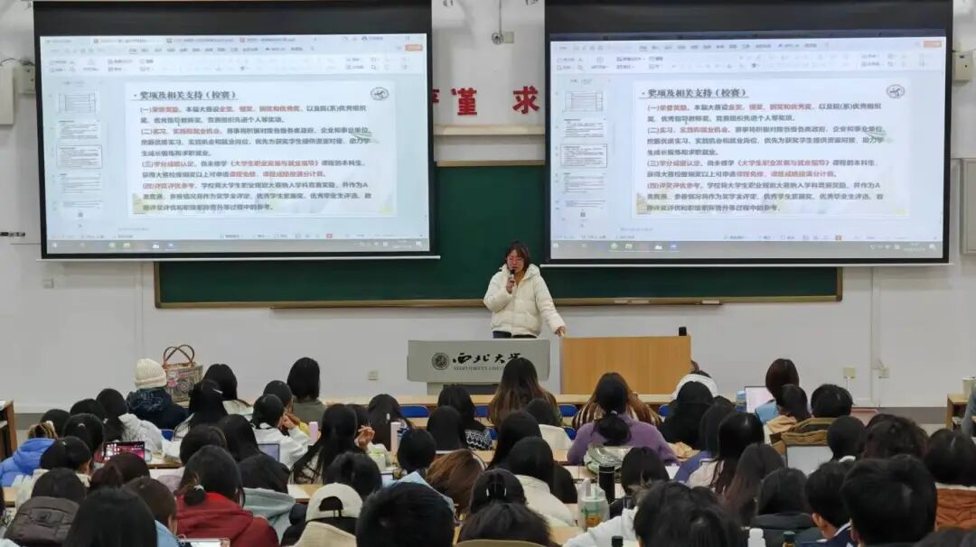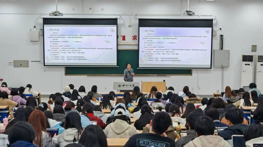 为帮助学生明确职业发展方向,树立正确的职业价值观,帮助同学们深入了解全国大学生职业规划大赛的参赛要点,高效备战职业规划大赛,2025年11月19日晚,我院在长安校区3J201举办大学生职业规划大赛经验分享会。往届大赛优秀选手代表以线上线下结合的方式进行分享,吸引百余名学生到场参与。会议由辅导员李钰莹主持。