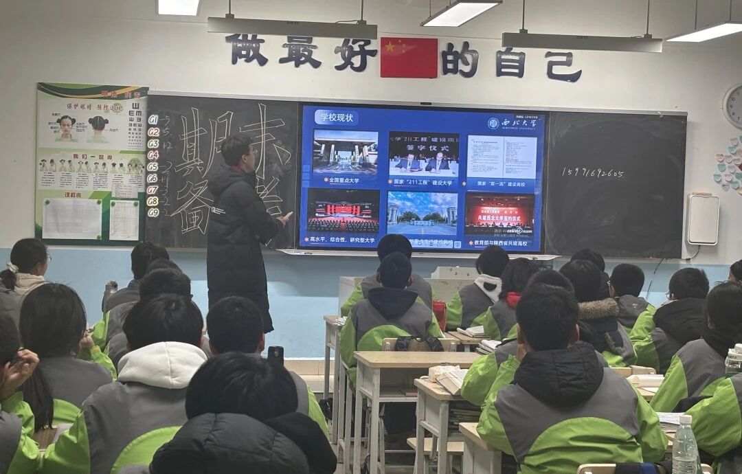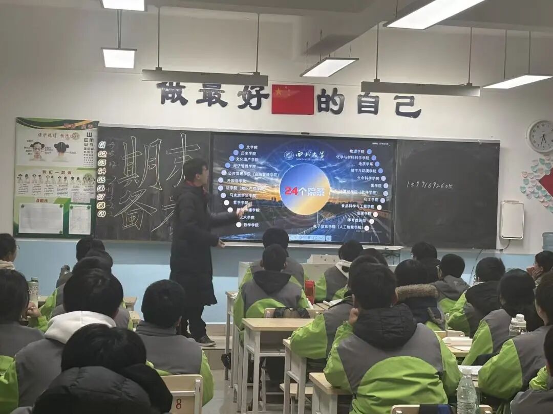 宣讲伊始,“高中回忆” 成为打破陌生感的钥匙。队员们分享着自己在经开二中的奋斗时光,那些埋首刷题的深夜、与同学并肩作战的日子、老师悉心指导的温暖瞬间,瞬间勾起了在场学子的共鸣,教室里满是青春的回响。紧接着,西北大学官方宣传视频缓缓播放,镜头下古朴典雅的校园建筑、丰富多彩的校园活动、实力雄厚的师资力量与独具特色的专业设置,全方位展现了西大的校园风貌与综合实力,让学弟学妹们对这所百年名校产生了浓厚的兴趣,眼中闪烁着向往的光芒。