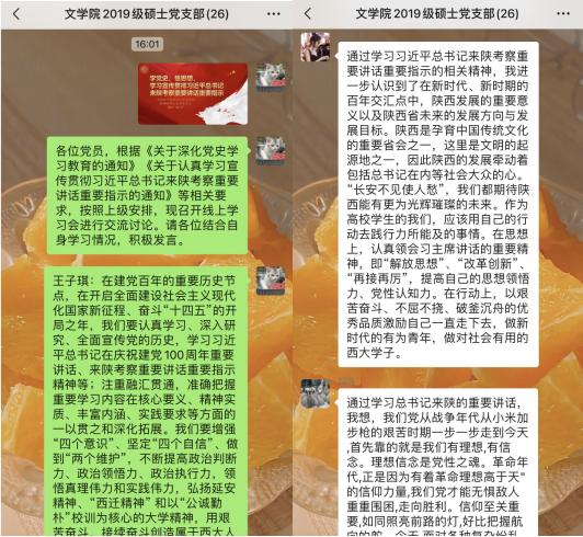 文学院研究生各党支部采用线上线下结合的方式,组织支部党员就习近平总书记来陕考察重要讲话重要指示精神、习近平总书记“七一”重要讲话精神等内容进行了集中学习,组织观看了习近平总书记来陕考察的相关新闻视频与文字材料,重点领会了总书记“解放思想、改革创新、再接再厉”的要求,从学生党员的自身实际出发,深刻把握讲话精神实质要义,并与党史学习教育第一阶段的学习成果相结合,做到融会贯通。