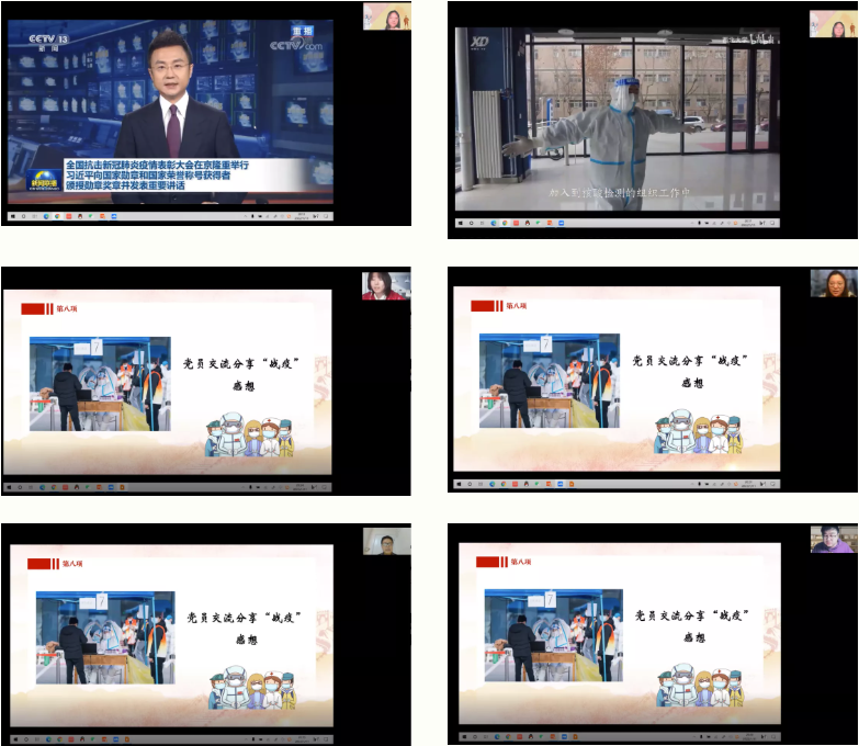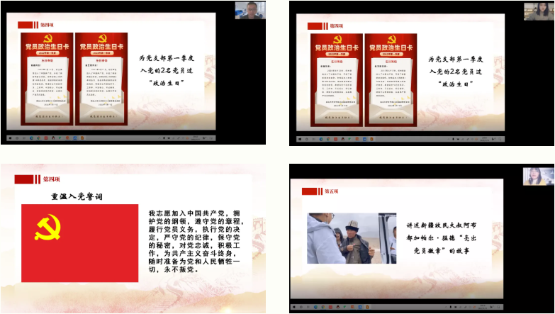 在“亮出党员徽章·牢记党员身份”环节,党支部为第一季度入党的2名党员谢鑫同志、赵艺阳同志过“政治生日”,线上赠送了“生日卡”,杨萌同志带领全体支部党员重温入党誓词,引导每一位党员始终牢记自己的先锋队员的政治身份,始终保持一种政治生命的体验,始终保持一种组织归属感和身份荣誉感。随后,党支部组织委员张曼分享了新疆牧民大叔阿布都加帕尔·猛德“亮出党员徽章”的感人故事。