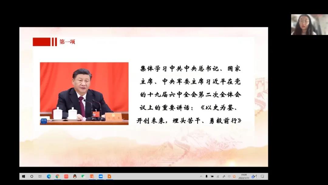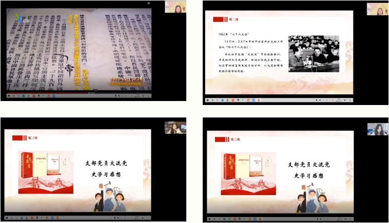 党支部书记杨萌通过故事情景讲述、纪录片播放等形式为党员们介绍了1925年1月11日至22日在上海召开的中共四大和1962年1月11日至2月7日中共中央召开扩大的工作会议(即七千人大会)相关党史故事。马琳、刘诗、洒旭等党员代表分别分享交流了党史学习感想,纷纷表示在学习党史中深刻体会到了我们党勇于自我革命,从严管党治党的鲜明品格,也在学习党史中不断增强了对党的信心、对中国特色社会主义的信念。