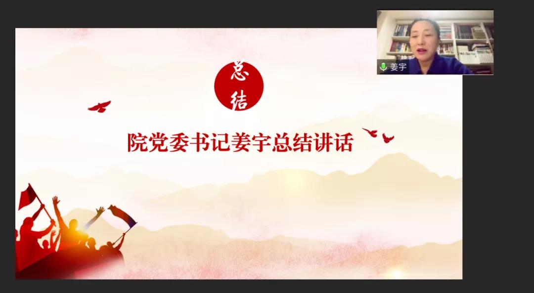 最后,院党委书记姜宇进行了总结指导,鼓励全体党员要坚定信心、共克时艰,并对党员们提出了三点期望与要求,一是要以身作则,严格遵守学校的各项防疫要求;二是要调整状态,静心思考,认真开展线上学习,积淀专业素养;三是要积极传播正能量,不信谣、不传谣,要以积极乐观的心态影响身边人。
