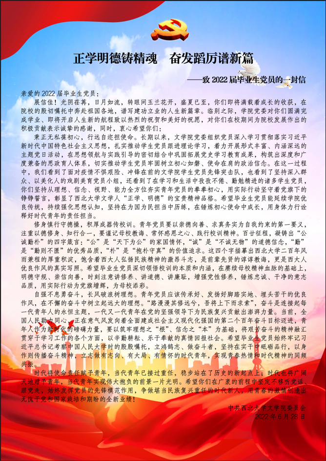 2022年毕业季,文学院党委通过“三会一课”、座谈会、茶话会等线上线下相结合的形式,组织开展了“青春献礼二十大 踔厉奋发新征程”系列毕业生党员离校教育和爱校荣校教育活动。