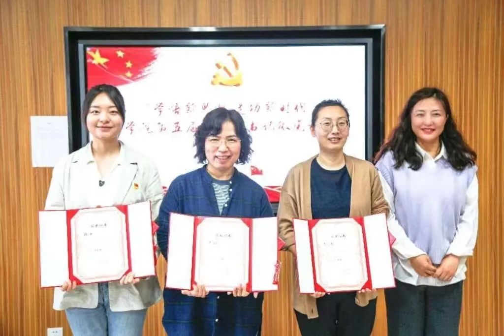 院党委书记姜宇为获得二等奖的党支部书记 杨萌、杨欣、张亚蓉颁奖