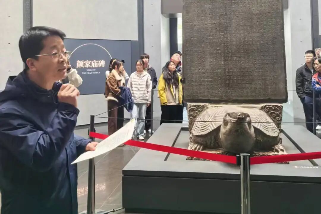参观结束后,古典文学与文献教师党支部赵阳阳同志讲授了《〈颜氏家庙碑〉中的廉政思想》专题党课。赵阳阳结合《颜氏家庙碑》碑文记载与历史背景,详细梳理了颜真卿的生平事迹,着重阐释其一生坚守的“廉洁刚贞”崇高品格。他紧扣碑文内容,指出其“居家孝悌、为官廉正”的言行准则是传统修身齐家文化中的生动体现。赵老师指出,颜氏家族世代传承的“文章书翰、兼修并重”家学门风,孕育出了绵延不绝的清廉政风与忠义气节,为新时代“营造风清气正政治生态”提供了深厚的文化滋养。这堂结合历史遗存实物的生动党课,将党的二十届四中全会关于全面从严治党的部署要求与中华优秀传统文化深度融合,引导师生党员从千年文化传承中汲取廉洁修身智慧,自觉做新时代廉洁文化的传承者、实践者和捍卫者。