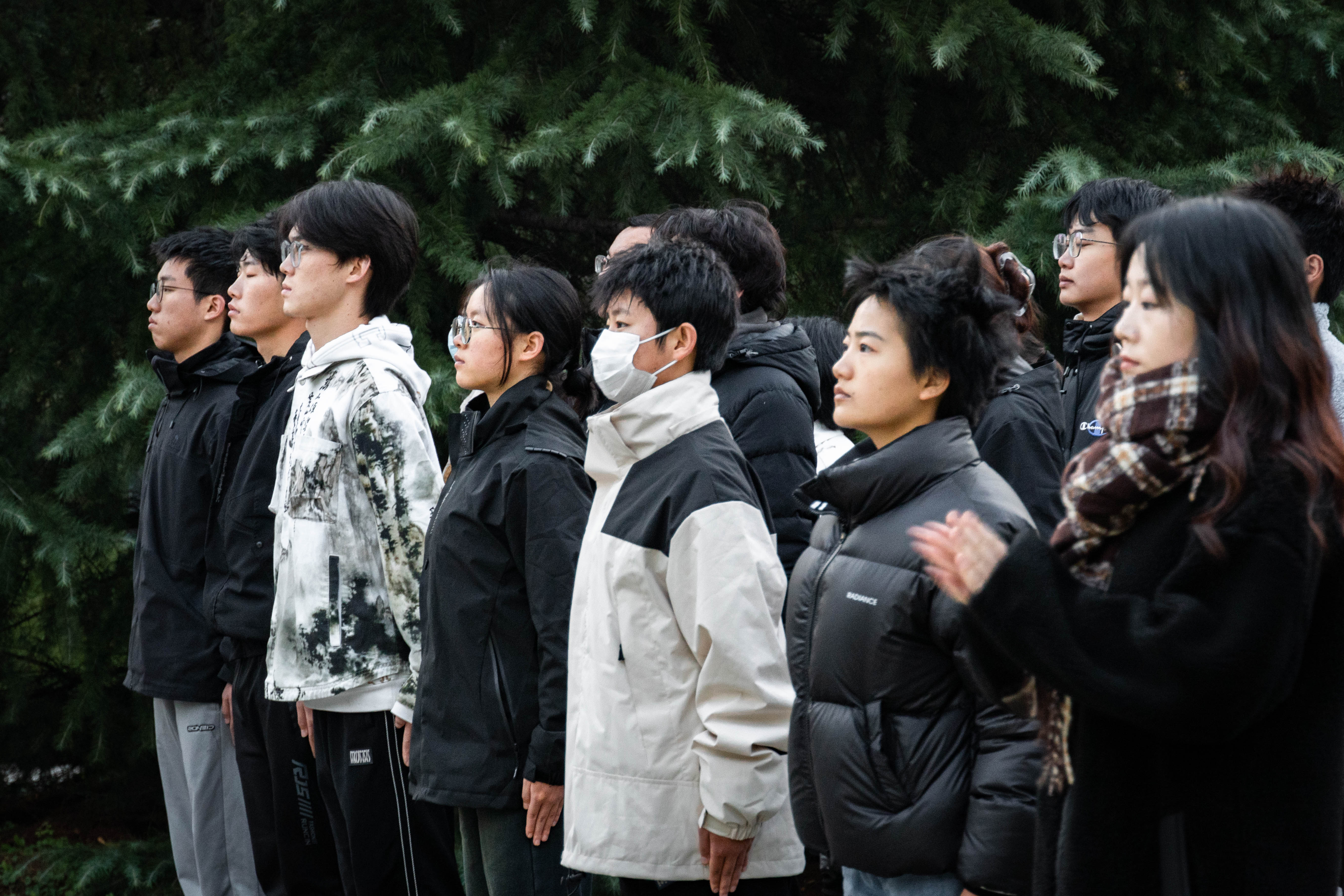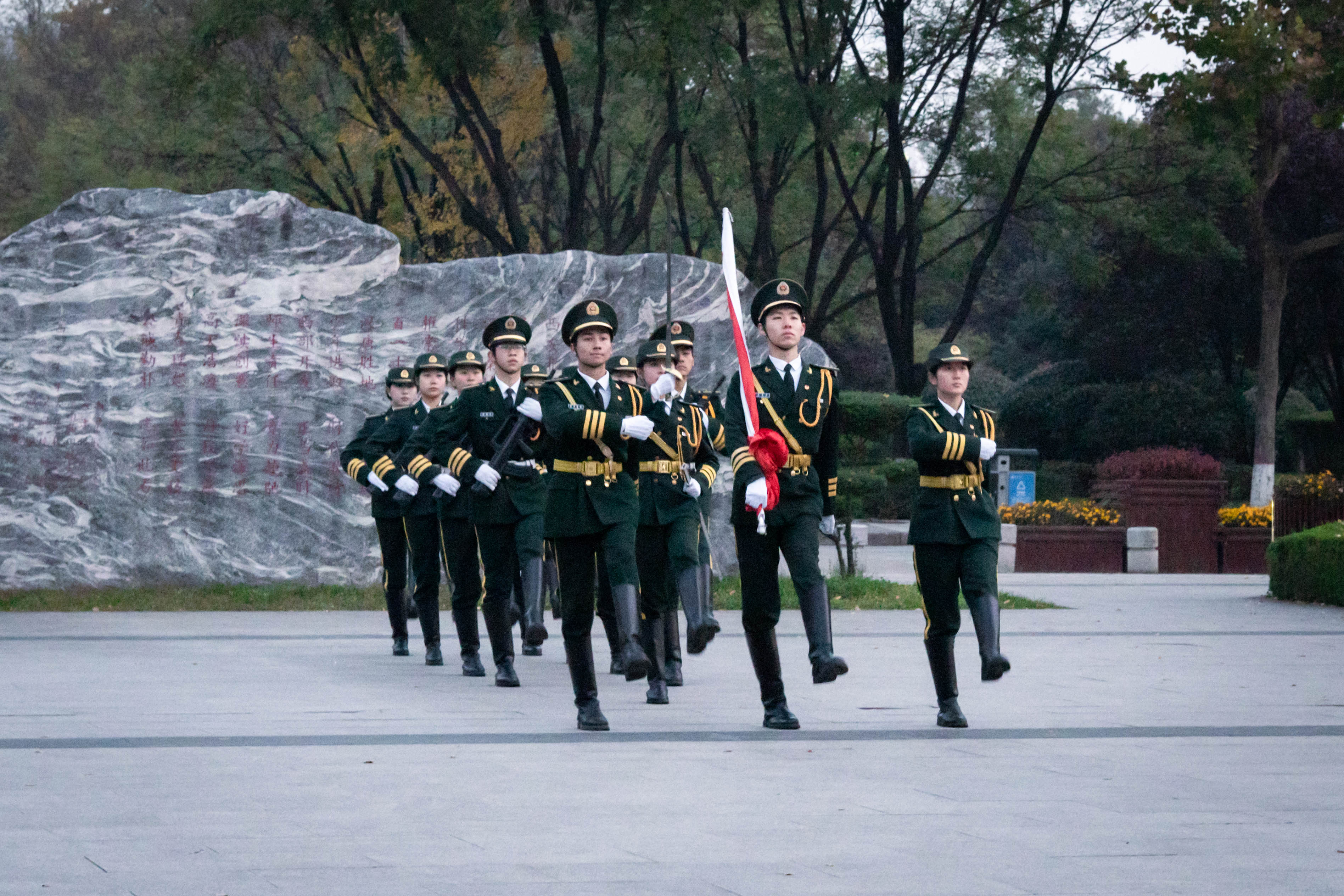 清晨,东方欲晓,日暮将启,石碑前早已站满了人。同学们望向终南山的方向,等待着国旗护卫队的身影。只见由十余人组成的国旗护卫队踏着正步走来,一名旗手在前肩擎国旗,护旗手随行两侧。早晨七点,升旗仪式正式开始,全体学生肃立行注目礼。国旗护卫队庄严列队,步伐铿锵,将国旗护送到升旗平台,伴着庄严的国歌,五星红旗冉冉升起、迎风飘扬。