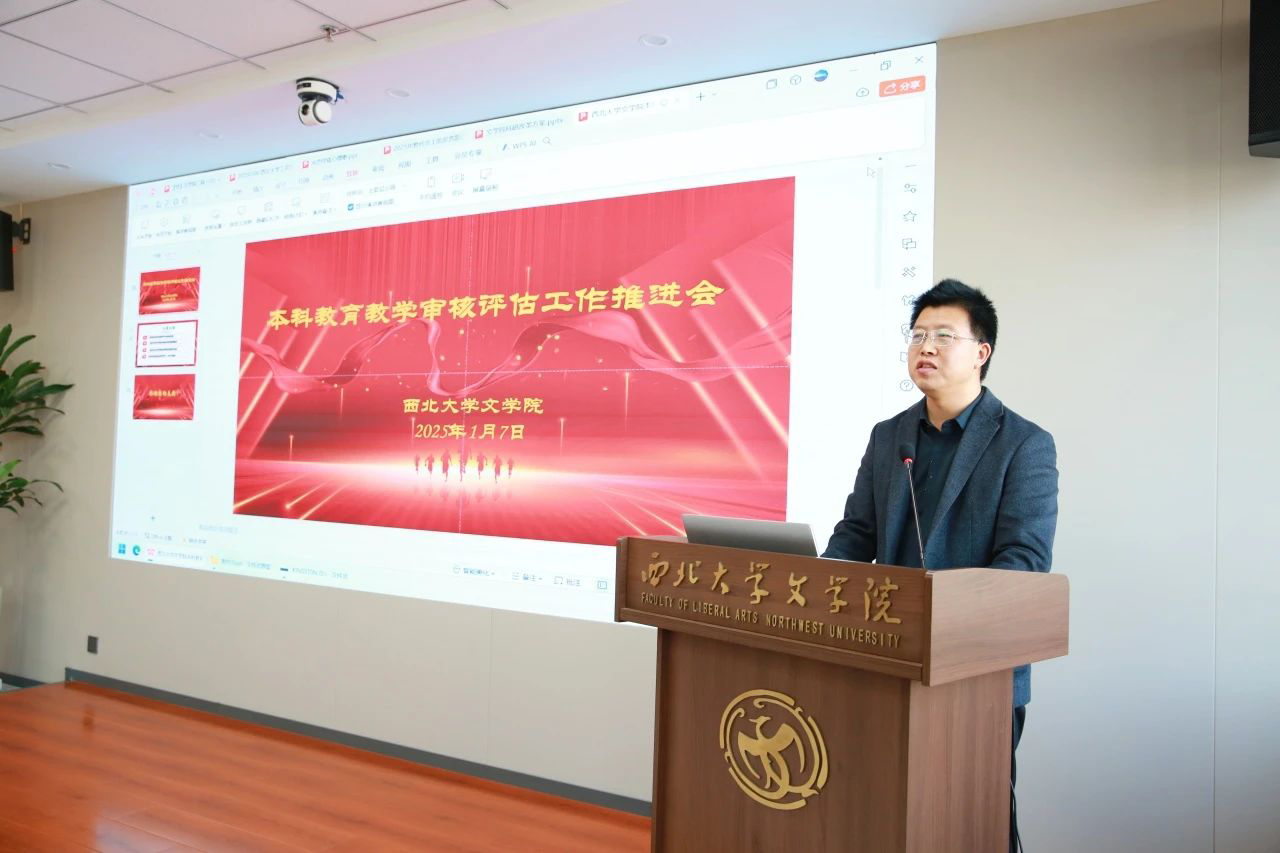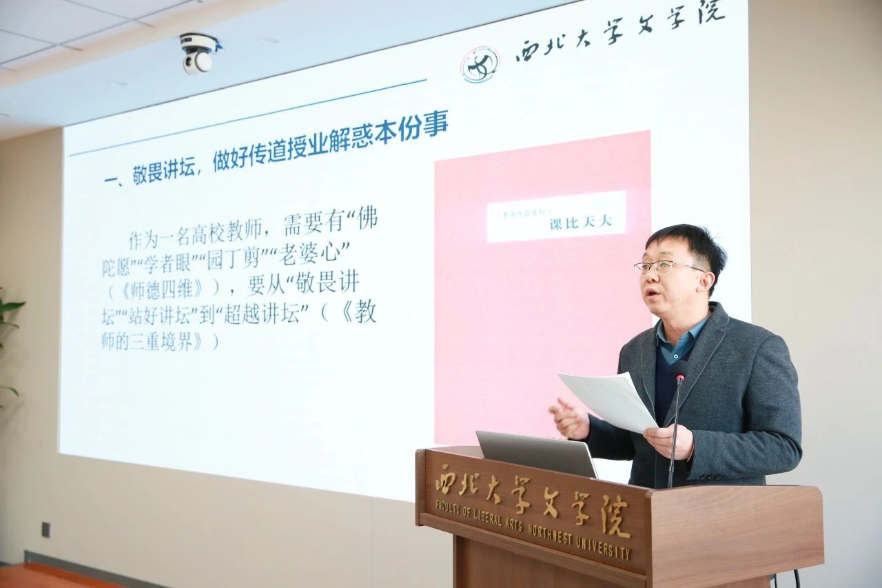 会议第二阶段,教学副院长陈晓辉就本科教育教学评估工作进行了汇报和安排,介绍了学院最新制定的教学管理制度和教学成果奖励办法。科研副院长陈然兴就贯彻落实《西北大学国家级项目、重大成果奖励提质增效若干措施》做深入细致讲解,介绍了学院为科研工作提质增效、培育重大项目、加强考核奖励等方面的改革举措。