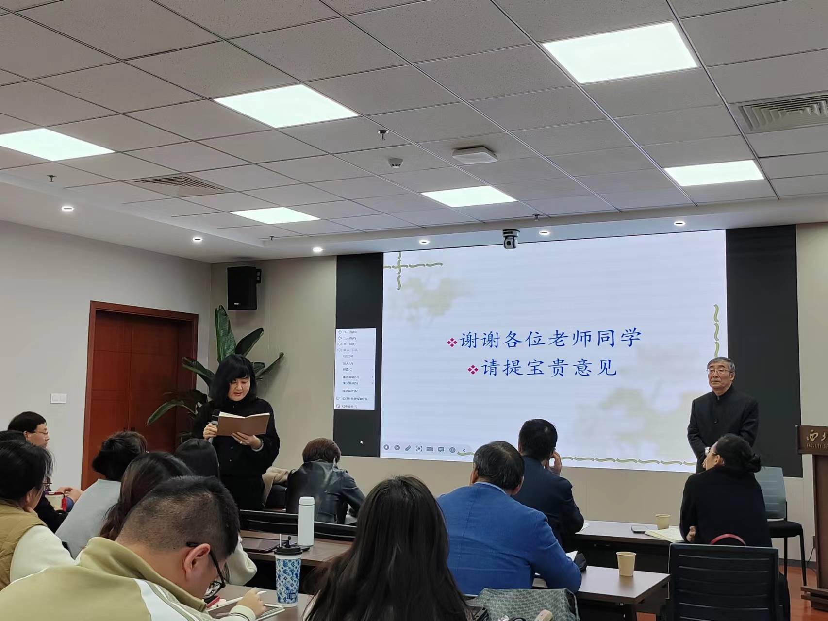 在与谈环节,赵小刚老师和高峰老师做了总结。赵老师从三方面来谈对此次讲座的感受。第一,邢老师的报告通过典型的材料,运用基本的语言学理论来归纳出可行的方法和心得,这种研究方法使他很受启发;第二,邢老师通过还原词音演变的过程和它当时的语言环境,并将一些链条上出现的例证都归纳在一起,使人信服,讲求证据的研究方法为我们提供了一些方法论的指导;第三,赵老师鼓励学生要学习音韵学知识,不要有畏难心理,同时说明语音研究不是独立的,要结合词汇、语法等多方面的知识才能使研究更透彻。高老师指出:邢老师的报告根据残存的痕迹对特殊词音进行探源,提及的文白异读和共时音变具有非常重要的研究价值。报告内容对特殊词音的研究具有指导意义和理论意义,总结的解决方案为同类研究提供了具体研究方法。高老师谈到,邢老师学术研究视野开阔,创新意识强、方法论意识强、理论意识强,经常能提出自己的新观点,有很多经典之作值得仔细阅读,同时,他的谋篇布局及对语言的追求也都值得大家学习。最后,高峰老师希望同学们要有创新意识和理论意识,脚踏实地做研究。