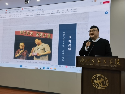 校党委副书记赵作纽致辞,他对范军副主席一行表示热烈欢迎,然后介绍了西北大学在校园文化方面的深厚积淀和在艺术美育方面的丰富实践。陕西省曲艺家协会主席苗阜介绍中国曲艺家协会“艺道鑫声”曲艺名家新秀示范演出宣讲行动的宗旨和范军副主席的艺术简历。范军副主席的讲座,从自己和著名豫剧表演艺术家常香玉的师徒情缘讲起,他以常香玉大师在排练演戏、待人接物以及在病重之际为农民工演出的感人事迹,生动诠释了人民艺术家应该把高尚的艺德和精湛的技艺有机统一。接着,范军副主席介绍了自己和马季先生的结缘,分享了马季先生坚守的“你离人民有多近,人民就跟你有多亲”的质朴信念。最后,他结合自河南“非遗有范儿”小剧场演出的生动实践以及河南方言话剧三部曲《老汤》《老街》《老家》的创意探索,着重强调,新时代的文艺创作应该立足有地方特色的现实素材,深入挖掘文化内涵,以开阔的视野积极尝试曲艺和戏剧戏曲等姊妹艺术的跨界融合,最终实现中华优秀传统艺术的创造性转化和创新性发展。他勉励青年学子,要常怀感恩之心,做一个有信仰、有情怀、有担当的新时代文艺工作者,呼吁当代创作要回归城市、回归剧场、回归青年。