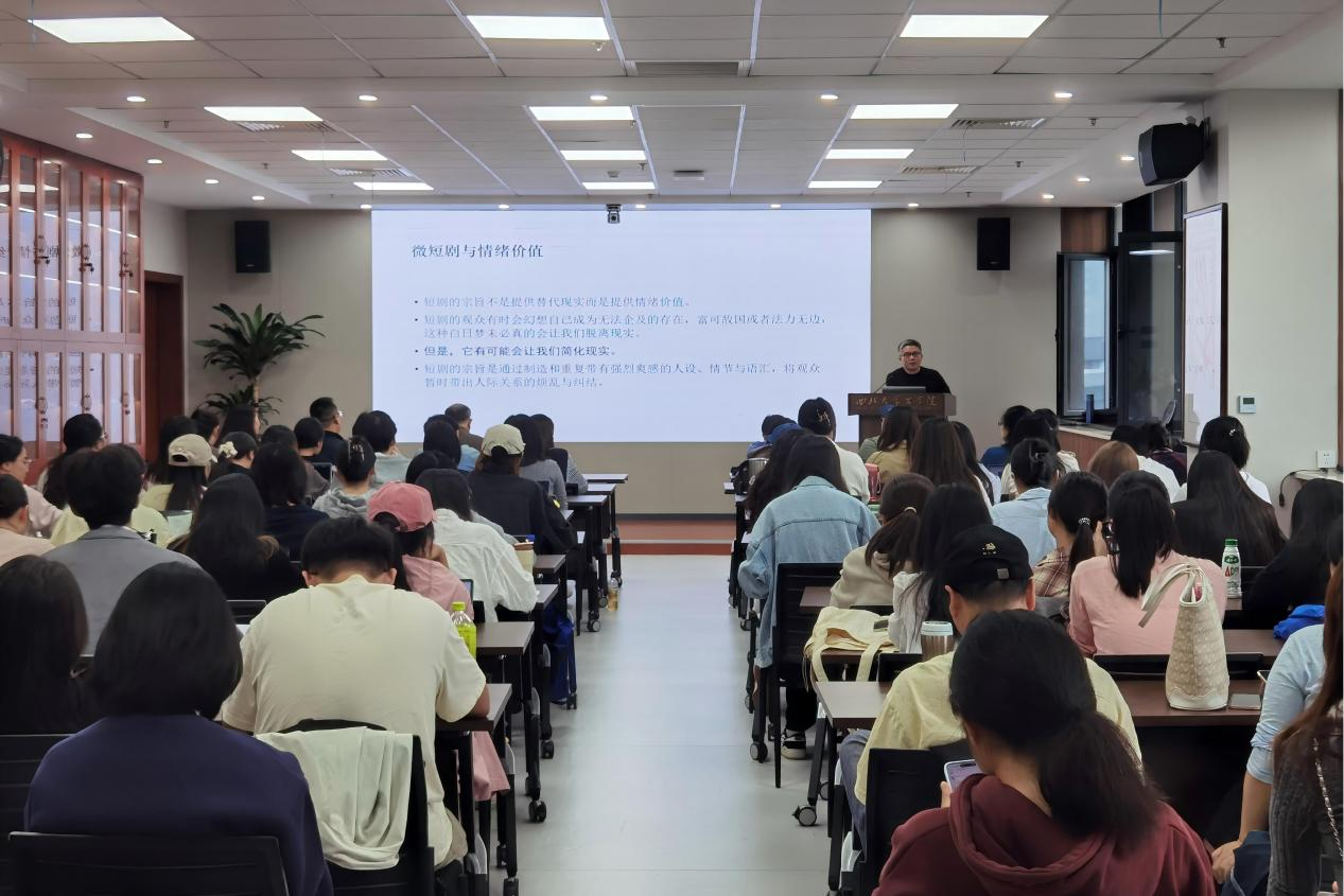 讲座反响热烈,引发师生广泛共鸣。互动环节中,汤拥华教授与在场师生展开深入交流。姜彩燕老师在点评中表示,该讲座通过分析微短剧深刻揭示当代情感结构,增强文学研究者的学术自信,展现文学研究的现实意义与理论价值。