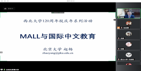 2022年10月21日下午,北京大学对外汉语教育学院院长赵杨教授做客我校120周年校庆年系列活动之“名家讲坛”,在线作了题为《MALL与国际中文教育》的学术讲座。讲座由文学院冯鸽教授主持,我院汉语国际教育系全体师...